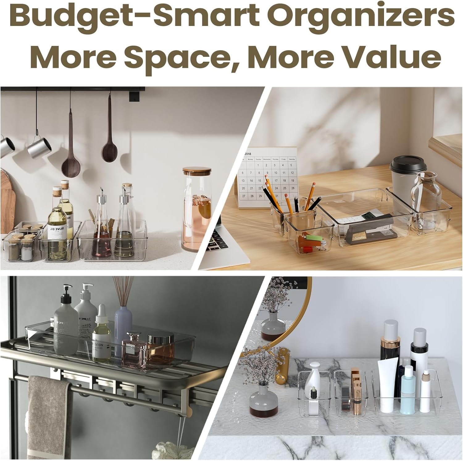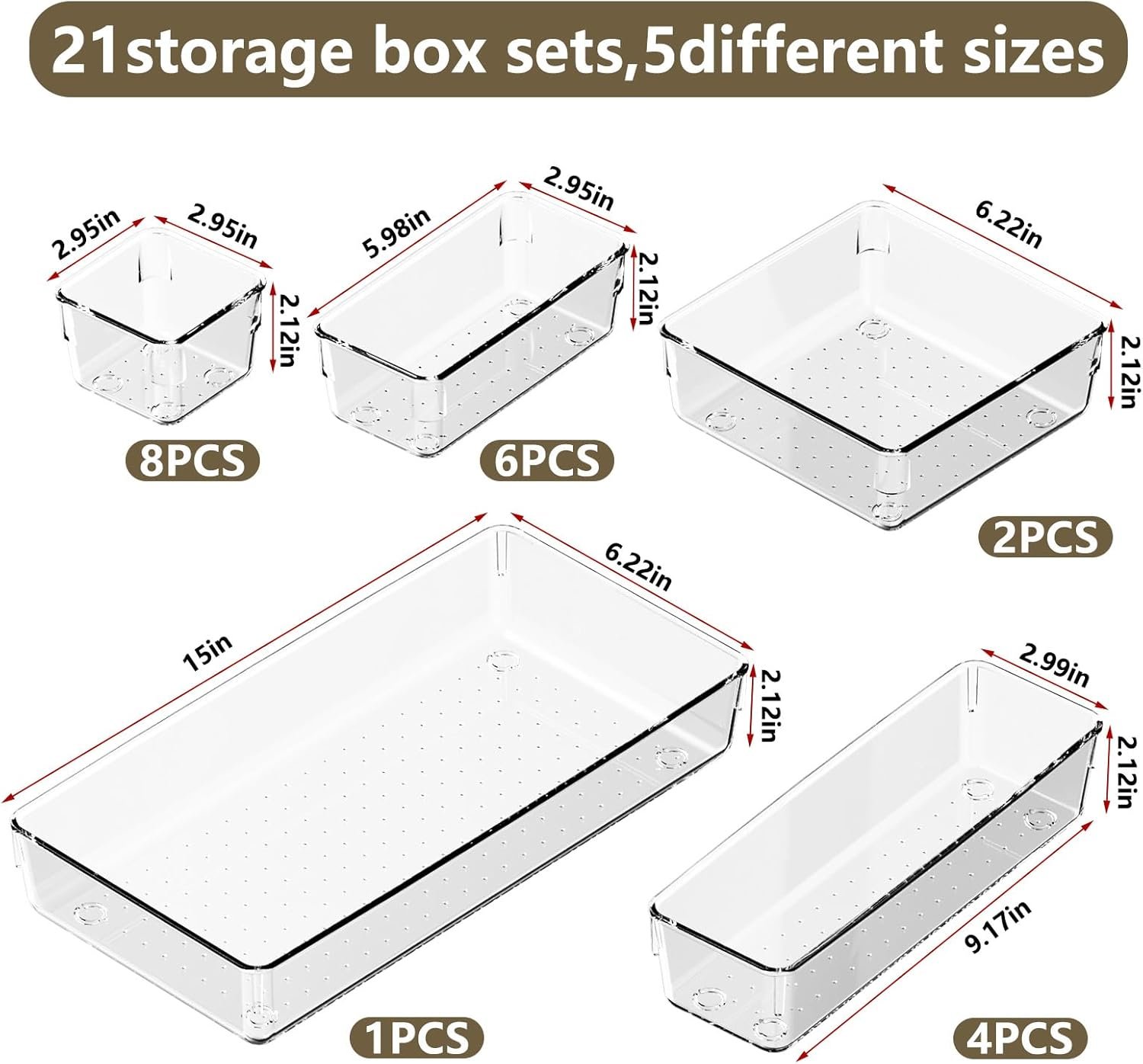21 PCS Clear Plastic Drawer Organizer Set, 5 Sizes Acrylic Drawer Storage Trays Non Slip Storage Bins for Makeup, Jewelry, Gadgets for Kitchen, Bedroom, Bathroom, Office