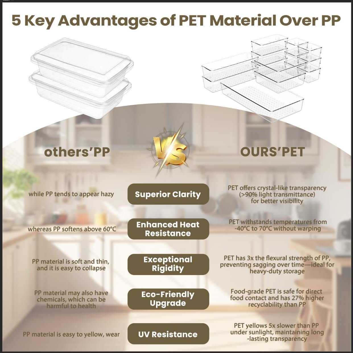Premium Material:Our drawer storage boxes are made of PET plastic. Compared to typical PP plastic storage containers, they offer higher transparency, better heat resistance, and food-grade safety—ideal for direct contact with ingredients. PET is also highly recyclable and maintains its shape over time without collapsing, making it the perfect choice for a quality lifestyle.