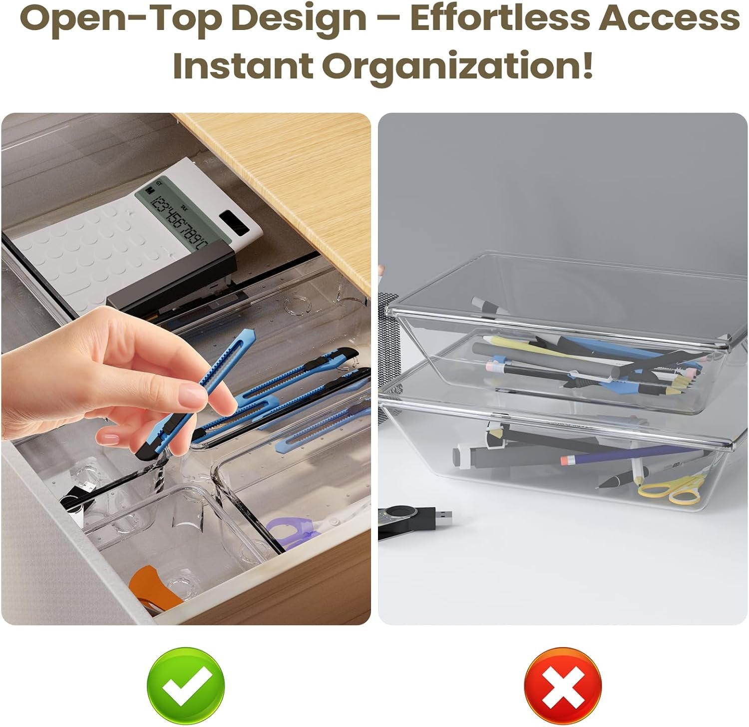Non-Slip Interior & Textured Surface:The interior base features a raised square grid pattern that enhances friction, effectively preventing small items such as jewelry, cosmetics, or office supplies from sliding during drawer movement. A complimentary non-slip silicone pad is included to attach to the bottom of the organizer, ensuring the product remains securely in place while opening/closing drawers.