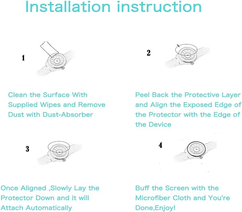 Customers find the screen protector fits well, is easy to apply, and comes with cleaning supplies. Moreover, they appreciate its quality and protective features, with one customer noting it eliminates potential scratches to the mineral glass. However, the bubble size receives mixed feedback, with several customers reporting bubbles in the corners. Additionally, one customer mentions issues with screen coverage, making it difficult to view the watch face.