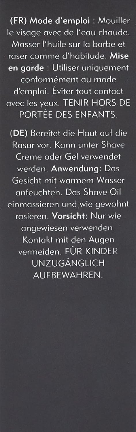 HOW TO USE: Wet face with warm water. Massage oil into beard and shave as usual.