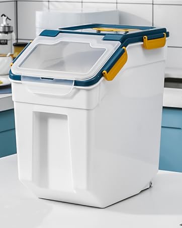 Our dog food storage container is made of BPA-free PP plastic and eco-friendly silicone, non-toxic and safe. Size(approx.): 32x23x36cm/ 12.6×9.05×14.17in (LxWxH). Capacity: Can hold up about 25lb flour/rice and about 20lb of pet food per container. Tip: Capacity will vary depending on the size of what you’re putting in, the capacity of the product is for reference only.