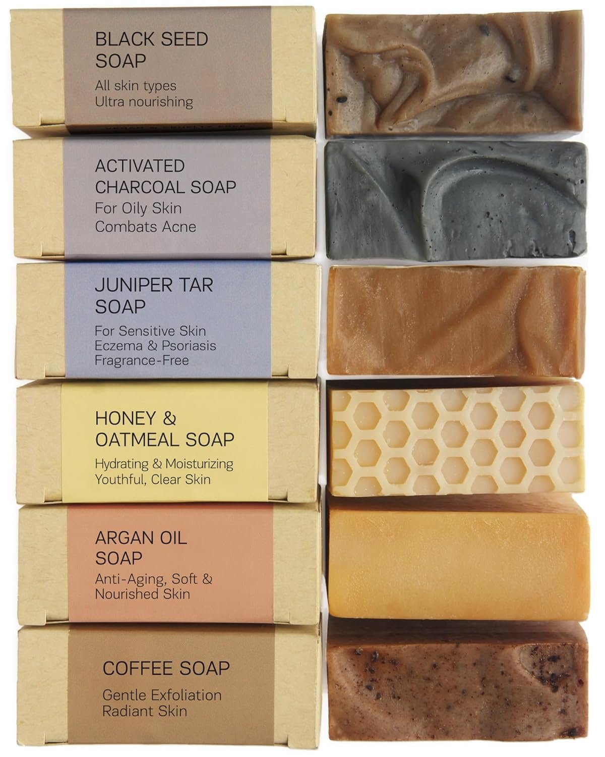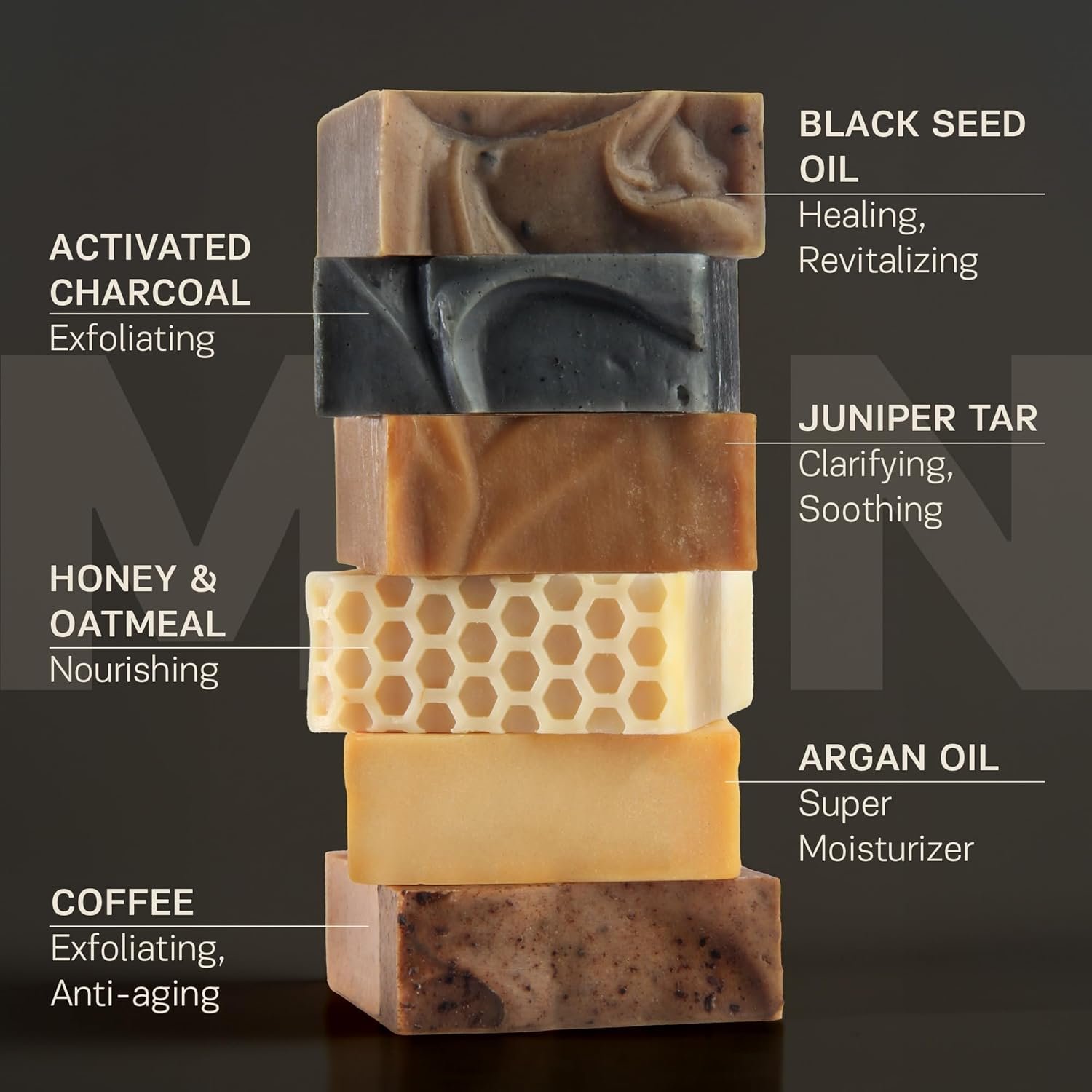 SPECIALLY CURATED FOR MEN – A thoughtfully assembled set of 6 natural bar soaps (Honey and Oatmeal, Blackseed Oil, Juniper Tar, Activated Charcoal, Argan Oil, Coffee) designed specifically for men’s skincare needs, providing deep moisturization and soothing effects.