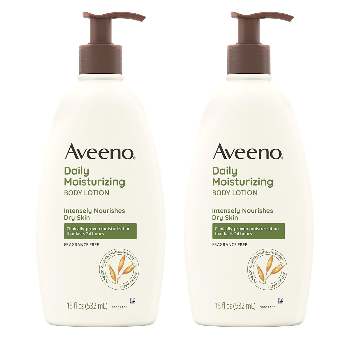Aveeno Daily Moisturizing Body Lotion with prebiotic oat is a clinically proven body lotion for women and men that delivers 24-hour moisturization and helps nourish and strengthen skin’s natural moisture barrier. This fragrance-free, paraben-free, dye-free, non-greasy, and non-comedogenic moisturizing lotion for dry skin absorbs quickly and is gentle enough for daily use as a moisturizer for dry skin. From a dermatologist recommended brand; formula is allergy tested and suitable for use as a body moisturizer in your skincare routine, providing 24-hour moisturization and visible results. Each pack includes two 18-ounce pump bottles for convenient and suitable for everyday use. Use this moisturizing lotion for dry skin on your body, hands, elbows, and other rough patches to relieve dryness and support your skin care goals. The non-greasy, fast-absorbing texture ensures comfortable wear throughout the day without clogging pores. Ideal for those seeking a body lotion for women or men, a body moisturizer, or a daily moisturizing lotion. Integrate Aveeno Daily Moisturizing Body Lotion into your skin care products and strengthen your skins moisture barrier. With a pack of two large bottles, you can ensure continuous hydration for your body and hands, making it a smart addition to your personal care routine.