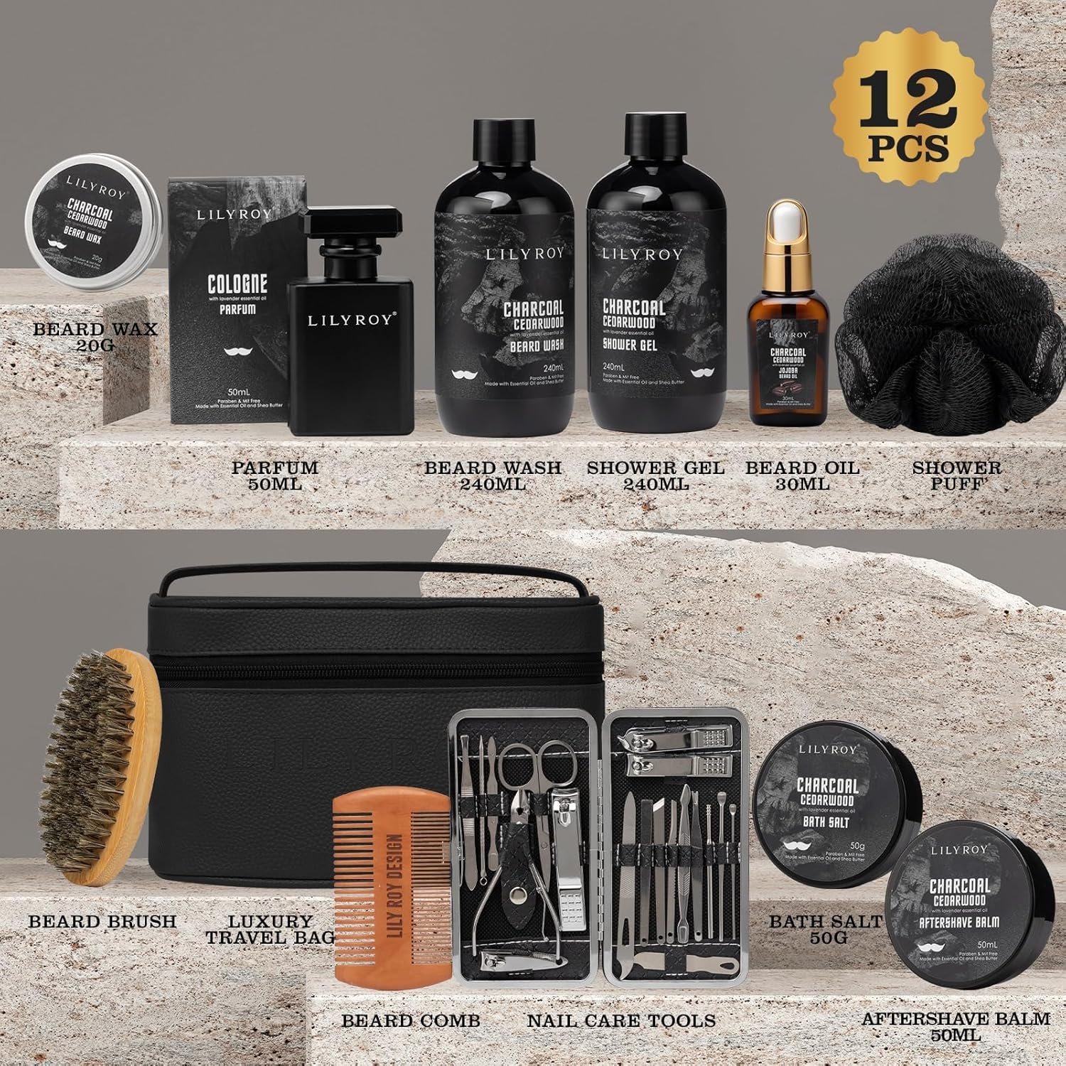 240mL Shower Gel240mL Beard Wash30mL Beard Oil50mL Parfum50g Bath Salt50mL Aftershave Balm20g Beard WaxBath Sponge19Pcs Nail Tool SetBeard BrushBeard CombTravel Bag