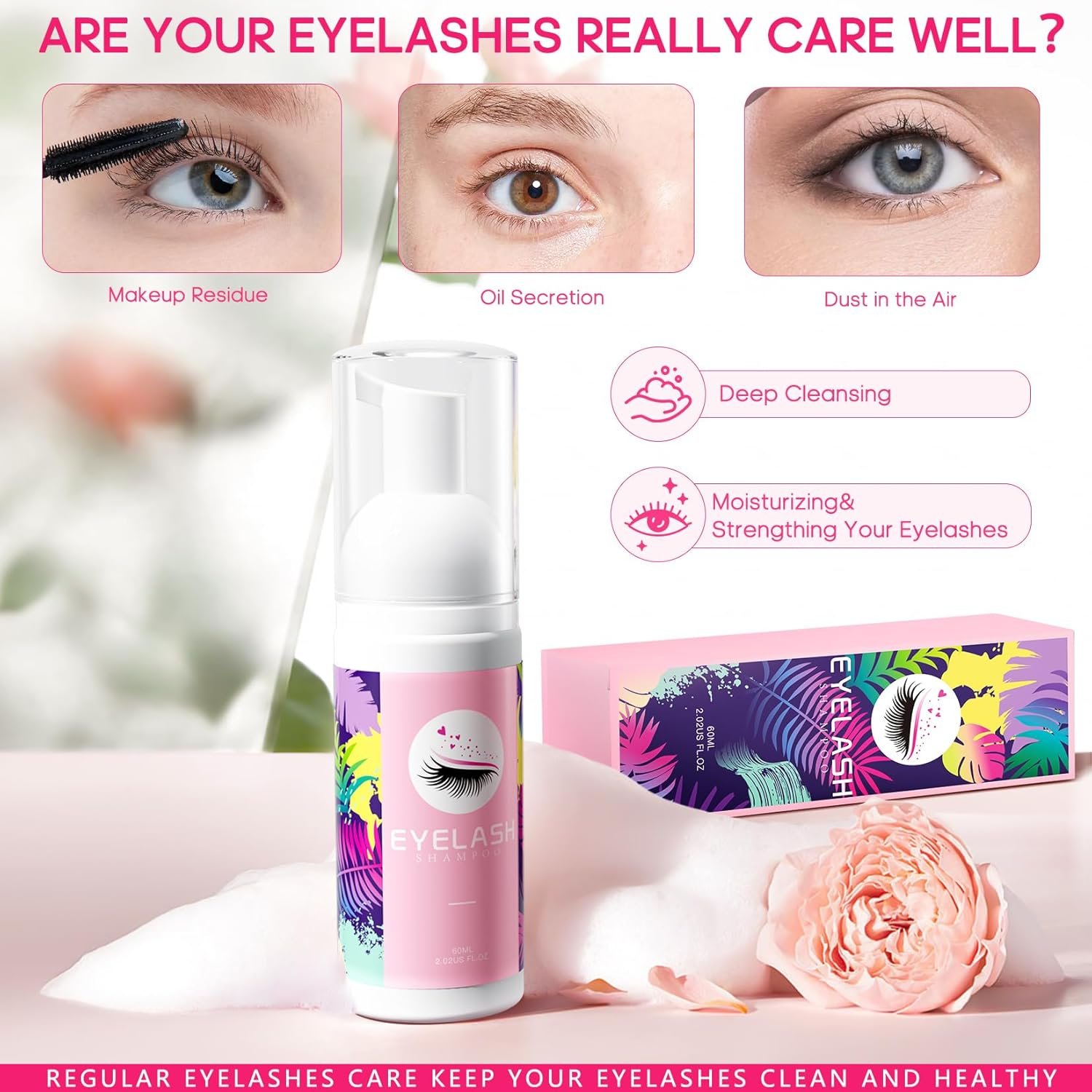 GENTLE LASH EXTENSION CLEANSER:Keep your lashes healthy,clean and long with our premium lash shampoo kit with fan! Our foaming lash shampoo not only cleans residue from your lashes,but also reduces lashes falling out.