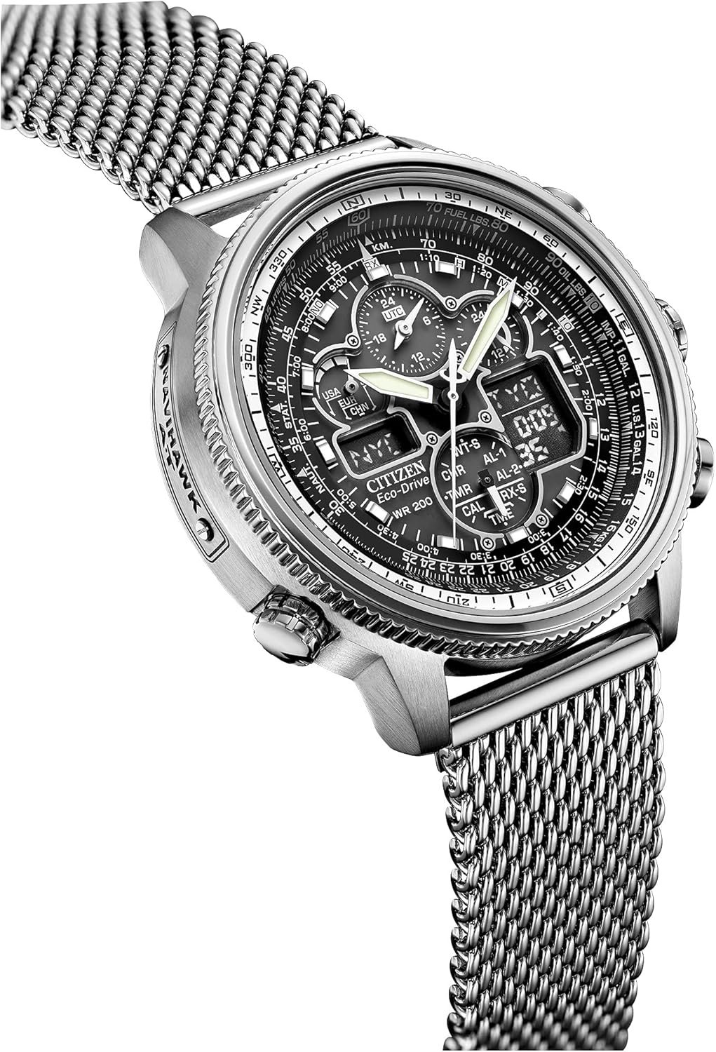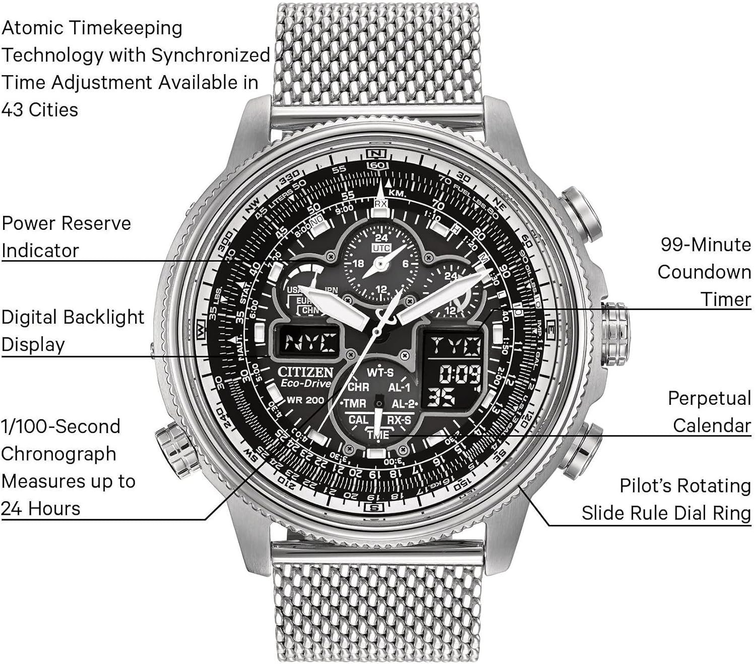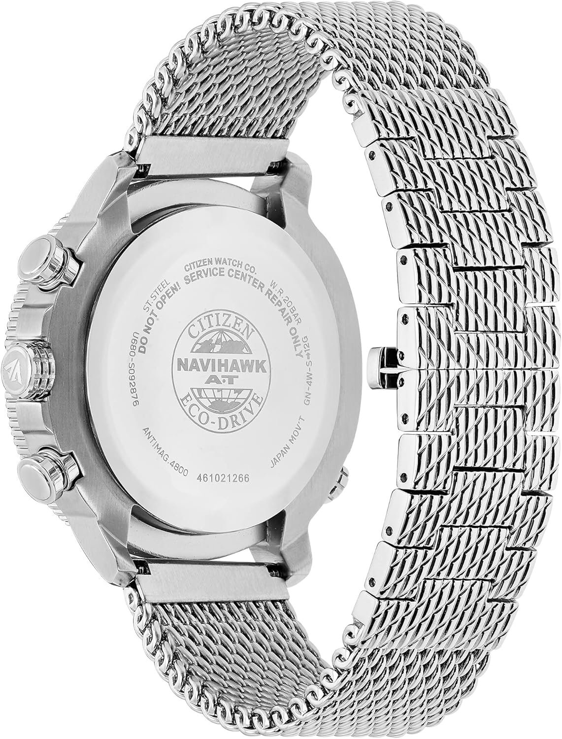 Go where the wind takes you with the Navihawk A-T. With atomic clock synchronization for superior accuracy, this perpetual calendar chronograph receives radio signals both automatically and on-demand in North America, the United Kingdom, Europe, Japan and China. The Navihawk A-T ensures you are always on time, no matter where your journey takes you. The stainless steel case, stainless steel mesh bracelet and black dial features world time in 43 cities, 2 alarms, 1/100-second chronograph, 99-minute countdown timer, UTC display and shock sensing function.Featuring our Eco-Drive technology – powered by light, any light. Never needs a battery. Caliber number U680.