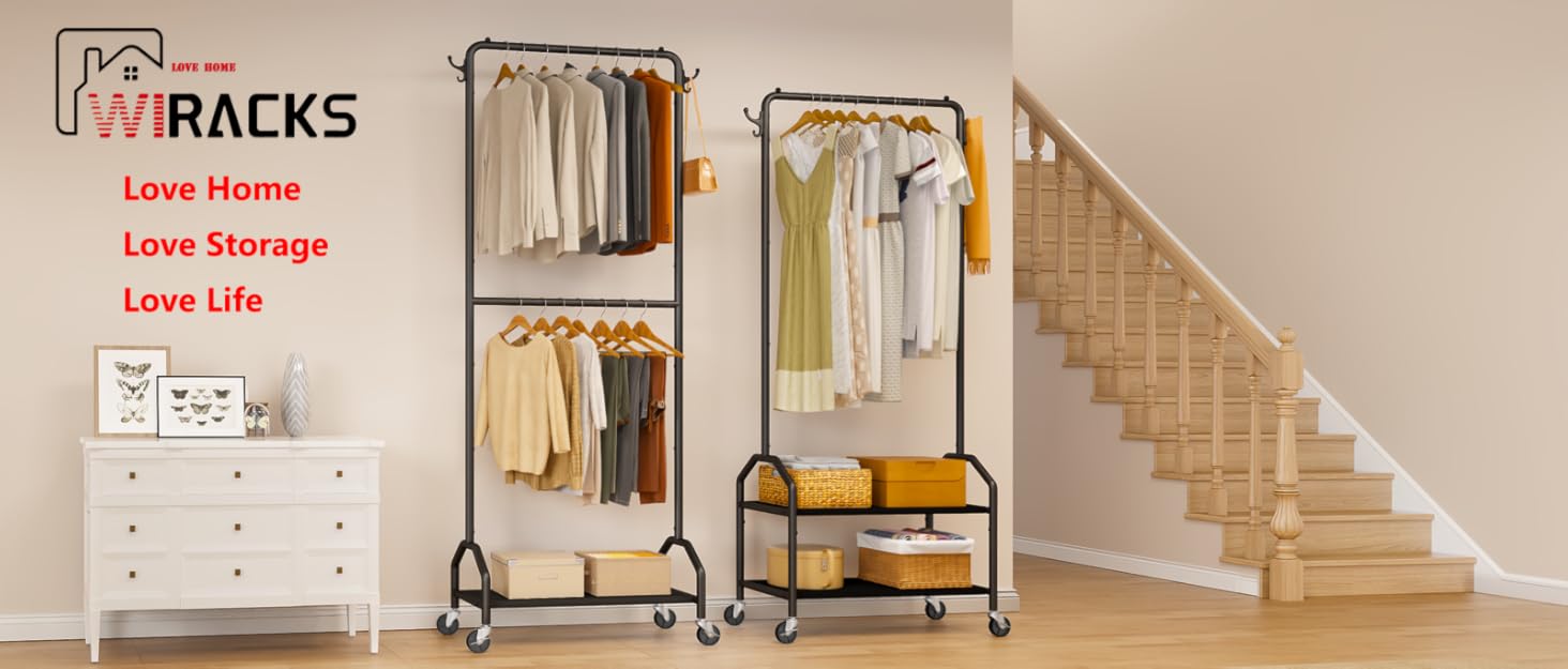 Industrail Rolling Wheels: wheels durable and able to withstand frequent movement, double hanging clothes rack with 2″ industral heavy duty wheels ,standing closet rack suitable for hardwood floors,rolling clothes rack with four wheels that rotate 360 degrees, and 2 of the wheels are lockable, and you can keep it still or slide them at will,Convenient for your clothes storage