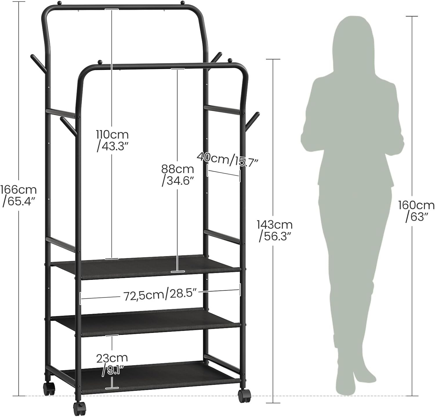 Color Black Material Iron, Oxford Fabric Product Size 28.5″L x 15.7″W x 65.4″H Package Contents – 1 x Rolling Garment Rack – 1 x Accessory Kit – 1 x Instructions