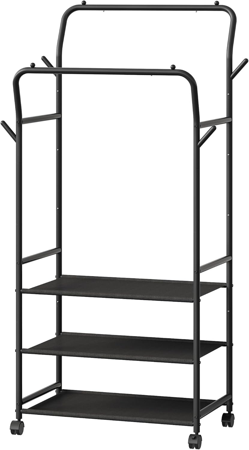 Multi-Functional 3-Tier Storage Design: This rolling garment rack features three fabric shelves for organizing shoes or folded items. Plus, side hooks are ideal for long coats, bags, or scarves, keeping all your essentials neatly in one place