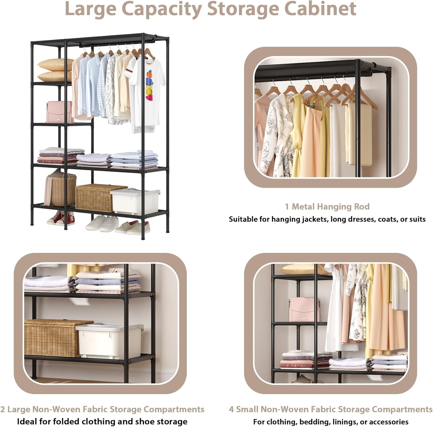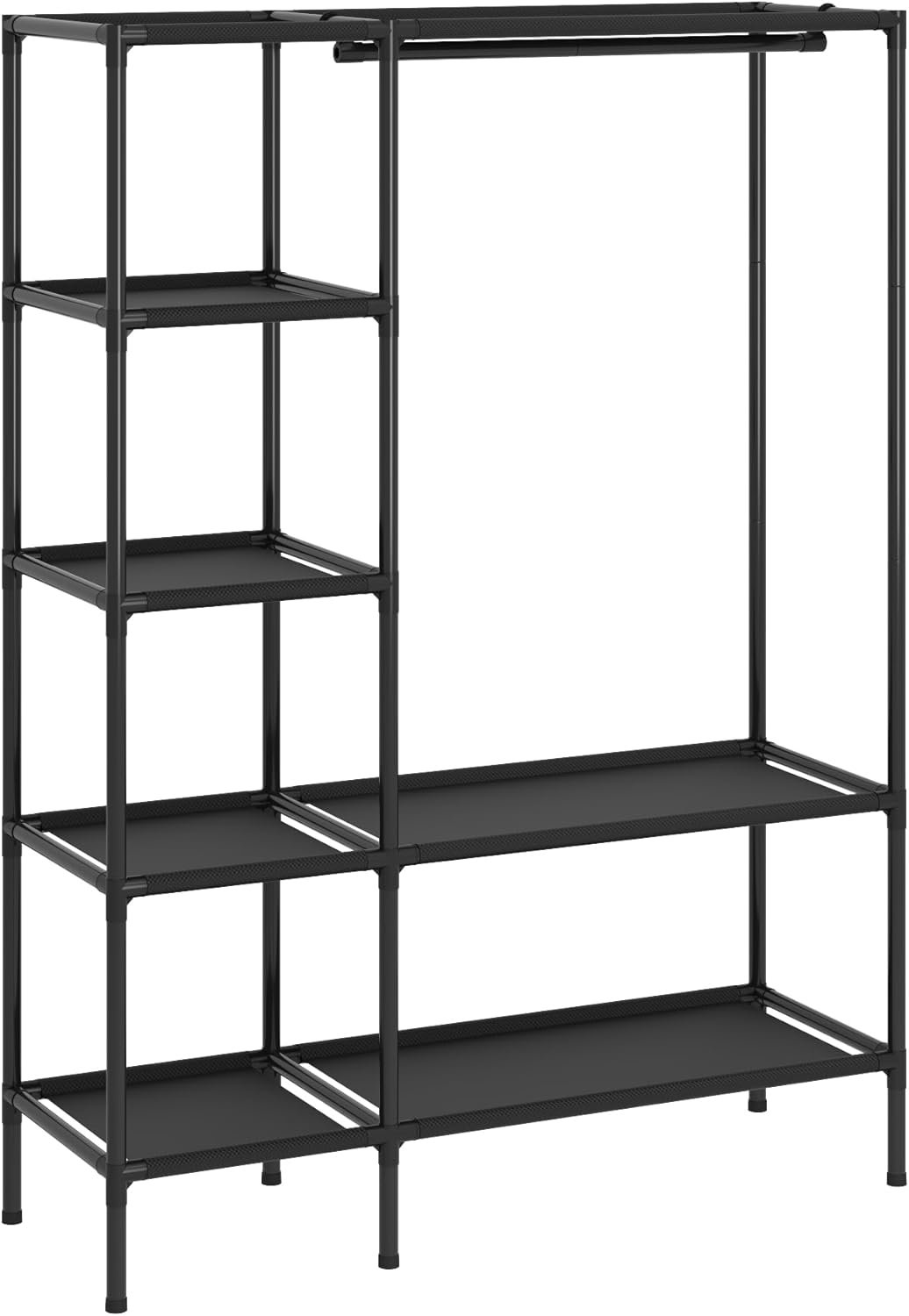 LARGE DIMENSION: Large wardrobe measures 50.2 inches wide, 17.48 inches deep, and 70.79 inches tall, providing ample storage space.STORAGE LAYOUT: Features 4 shelves on the left side and a full-length hanging rod on the right for versatile clothing .Combines open shelving with hanging space in a compact footprint, perfect for bedrooms, dorms, or temporary storage needs.organization.There are also 2 tiers of long shelves underneath the large empty space of the hanging rod for other accessories and shoes.STURDY CONSTRUCTION: Metal frame design ensures stability and substantivity for long-lasting use and storage.EASY TO ASSEMBLE: The vertical closet is made of 22mm metal rods, high quality waterproof and breathable non-woven fabric with plastic connecting holes and protective caps. The product is delivered with assembly instructions and an assembly video on the details page. No tools are needed, it takes only 30 minutes for one person to assemble it according to the tutorial on the detail page.EASY PORTABILITY: The overall weight of the closet stand is lightweight, which makes it very easy to assemble or disassemble, the disassembled parts have a small footprint and the assembled storage capacity is large, making it very easy to carry.Load-bearing: the load-bearing capacity of the entire closet reaches about 30KG.