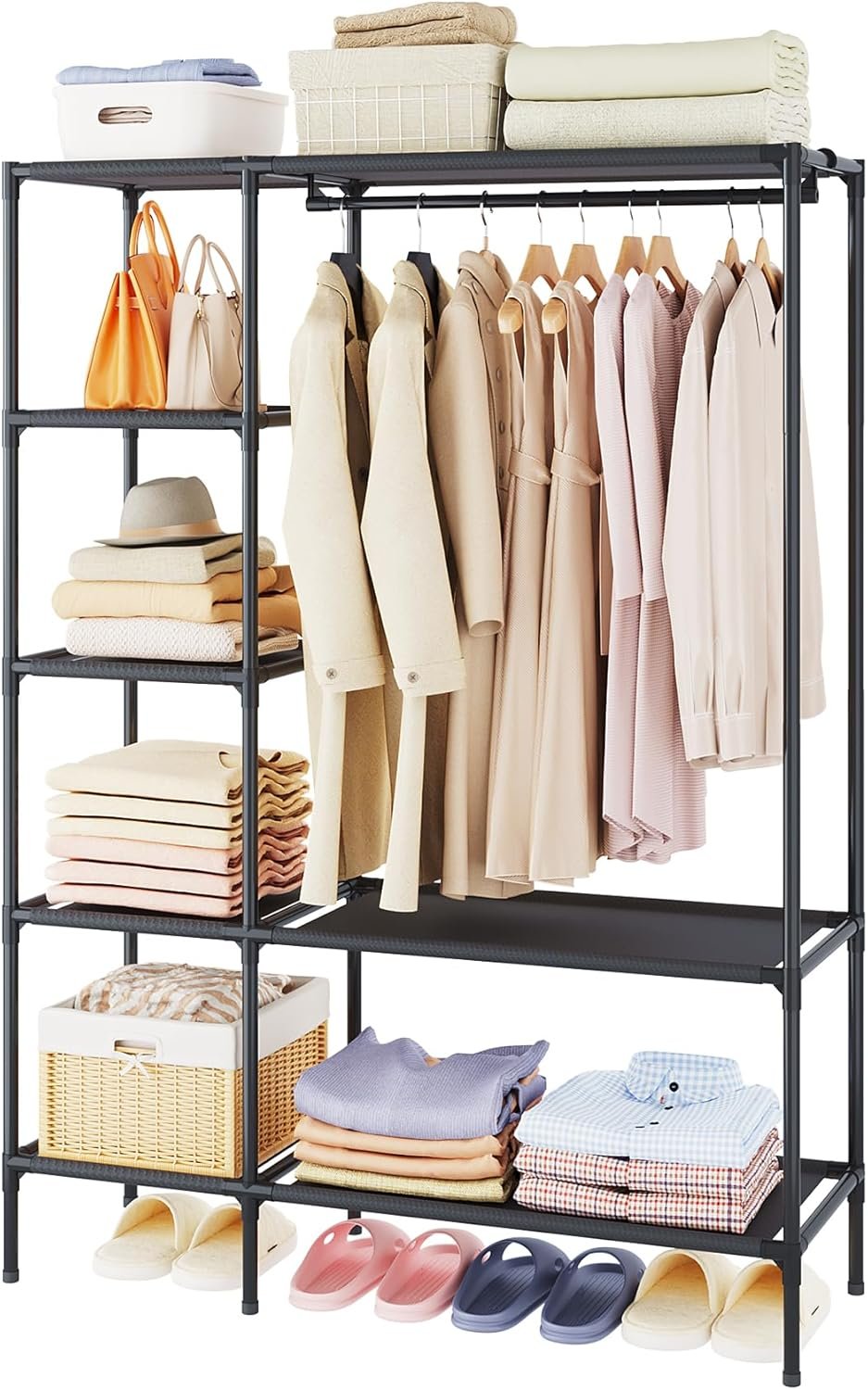 【Closet Organizers and Storage】 This clothes organizer rack has an integrated hanging and stacking area that can store long and short clothes, as well as bags. The bottom can also be used to store shoes, etc. The design is perfect for bedrooms, dorms, or temporary storage needs.