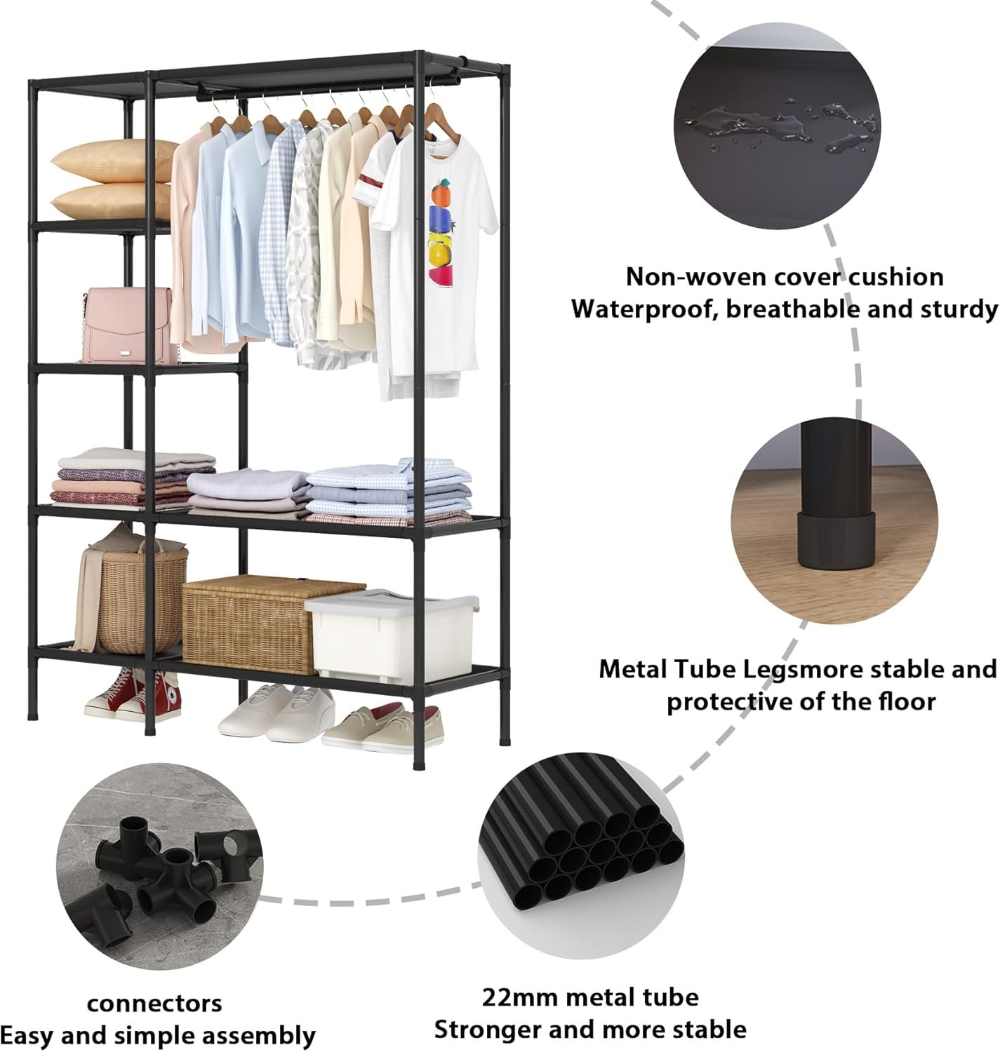 【Sturdy Construction】 The clothing rack with shelves is made of a 22mm metal rod and high-quality, waterproof, breathable, non-woven fabric. It also has plastic linking holes and protective caps. The metal frame design ensures stability andsubstantivity for long-lasting use and storage.