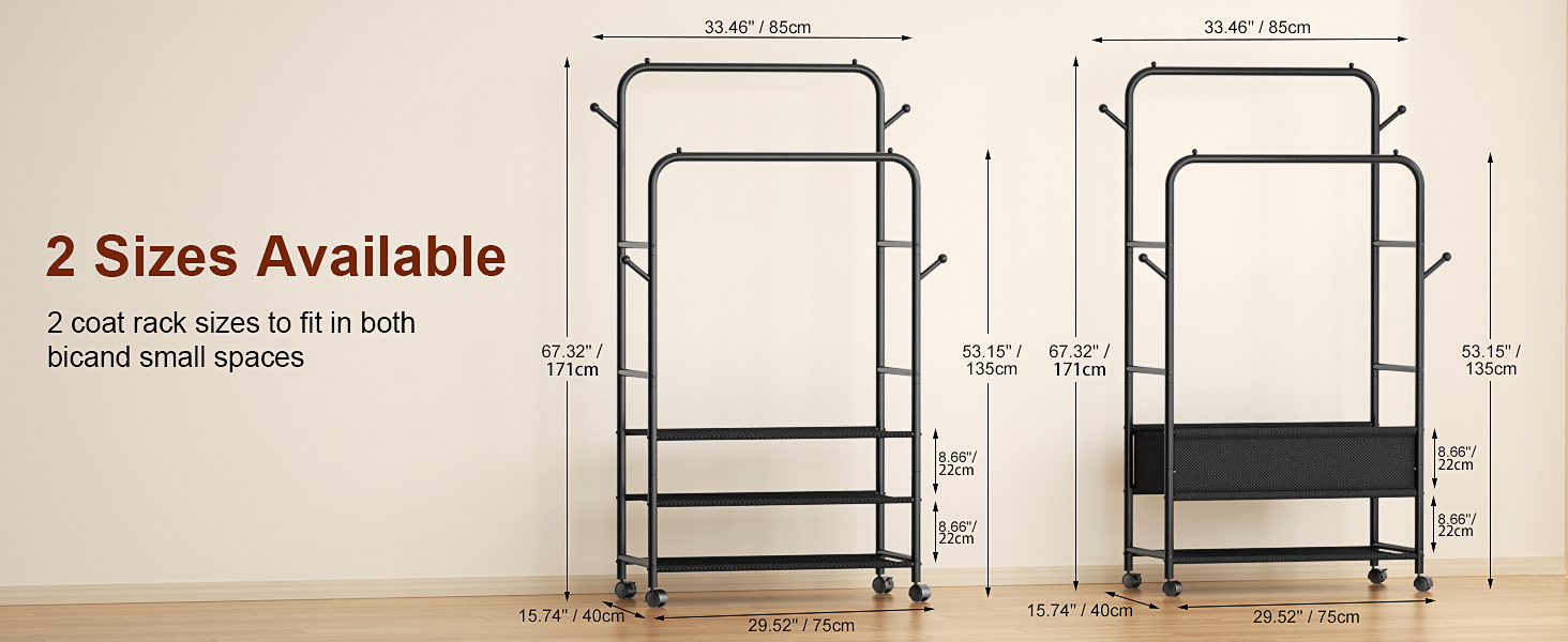 [Double Storage Space]: The clothing racks for hanging clothes has 2 hanging rods of different heights. Visual double storage space for easy sorting and putting away of clothes. The small footprint of the closet racks for hanging clothes can make full use of vertical space, so say goodbye to the trouble of piling up clothes!