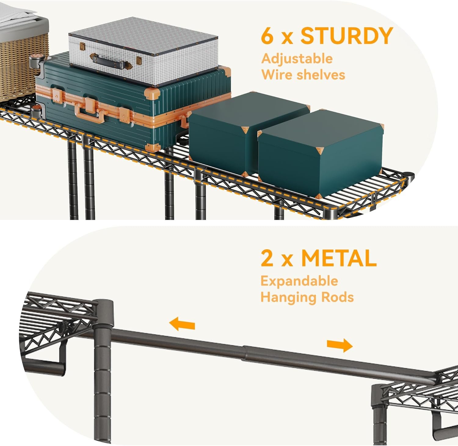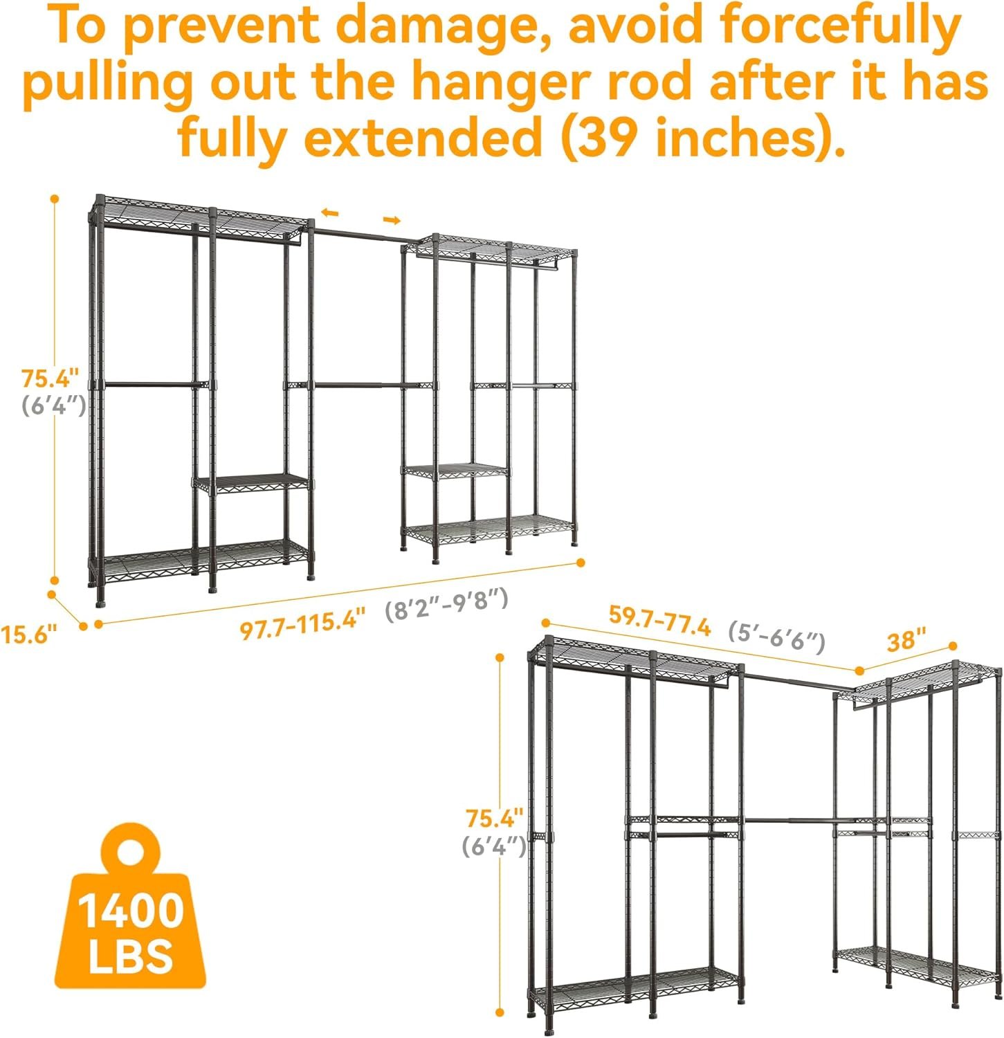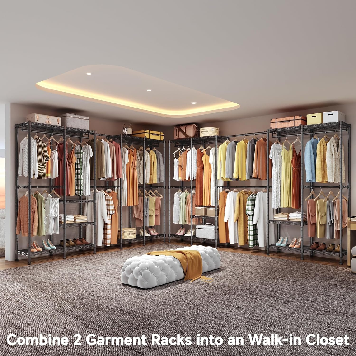 With 6 height-adjustable wire shelves and 7 detachable hanging rods, this large garment rack offers flexibility for storage needs.Suitable for home closets, bedrooms, laundry rooms, reach-in closets, walk-in closets, cloakrooms, and more, allowing you to effortlessly hang coats, pants, and other garments.The center hanging rod of this large clothes rack is designed to be length-adjustable, allowing you to expand or retract it to accommodate different room sizes.This wardrobe closet rack can be easily assembled into an L-shape, making it the perfect solution for maximizing storage in corner spaces.