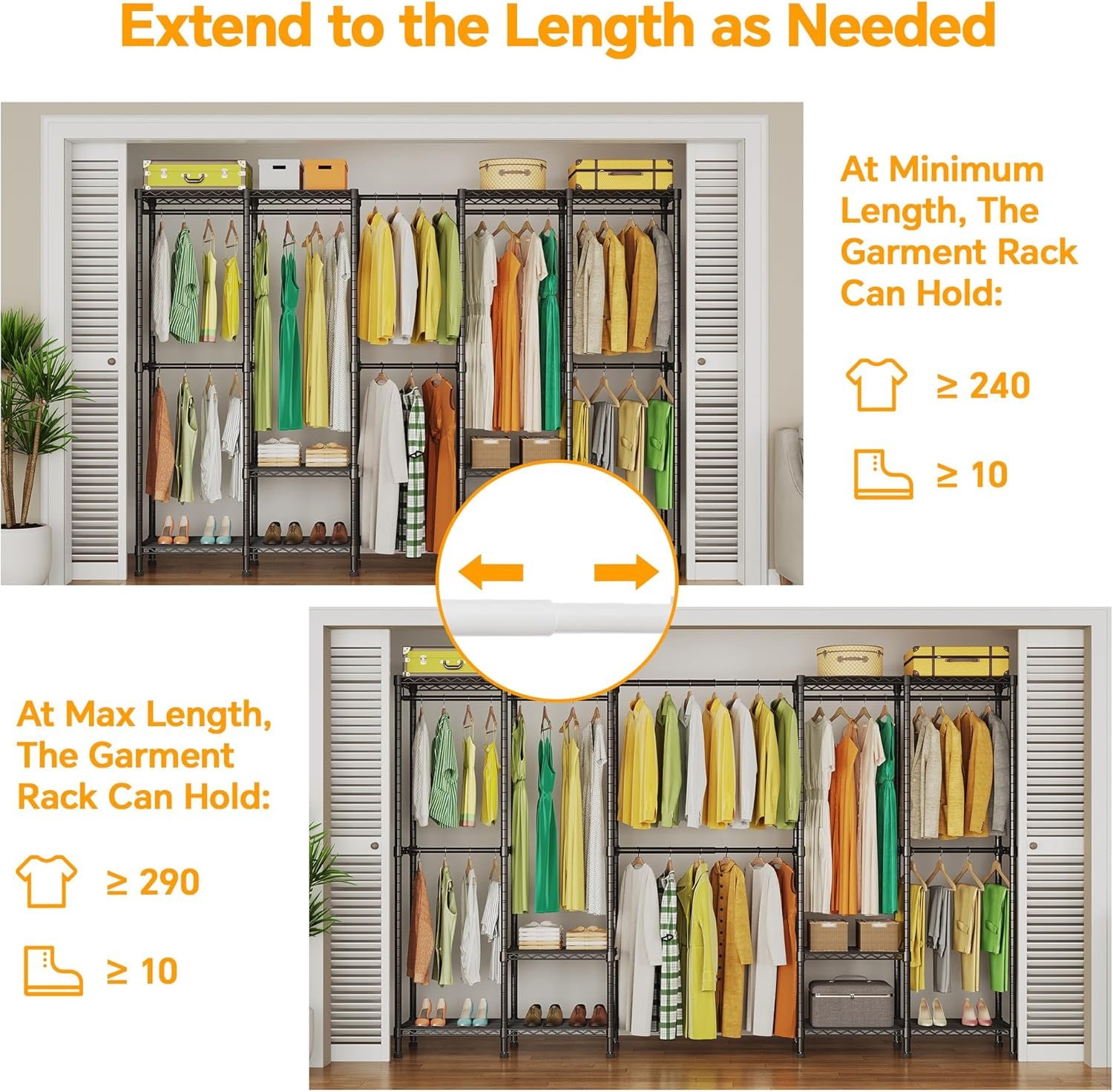 EXPANDABLE WARDROBE RACK: The two hanger rods in the middle row of our closet rack are expandable, allowing you to adjust the width of the entire wardrobe rack to fit the size of your space. Whether you have a walk-in closet or a reach-in closet, our closet rack provides the optimal fit