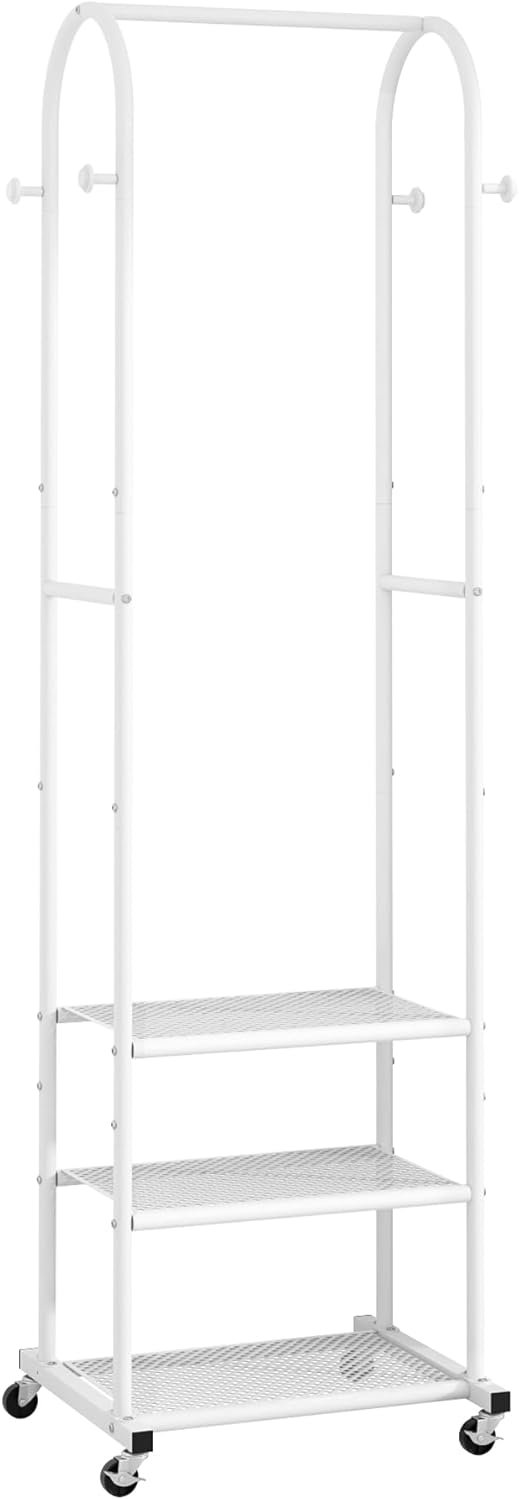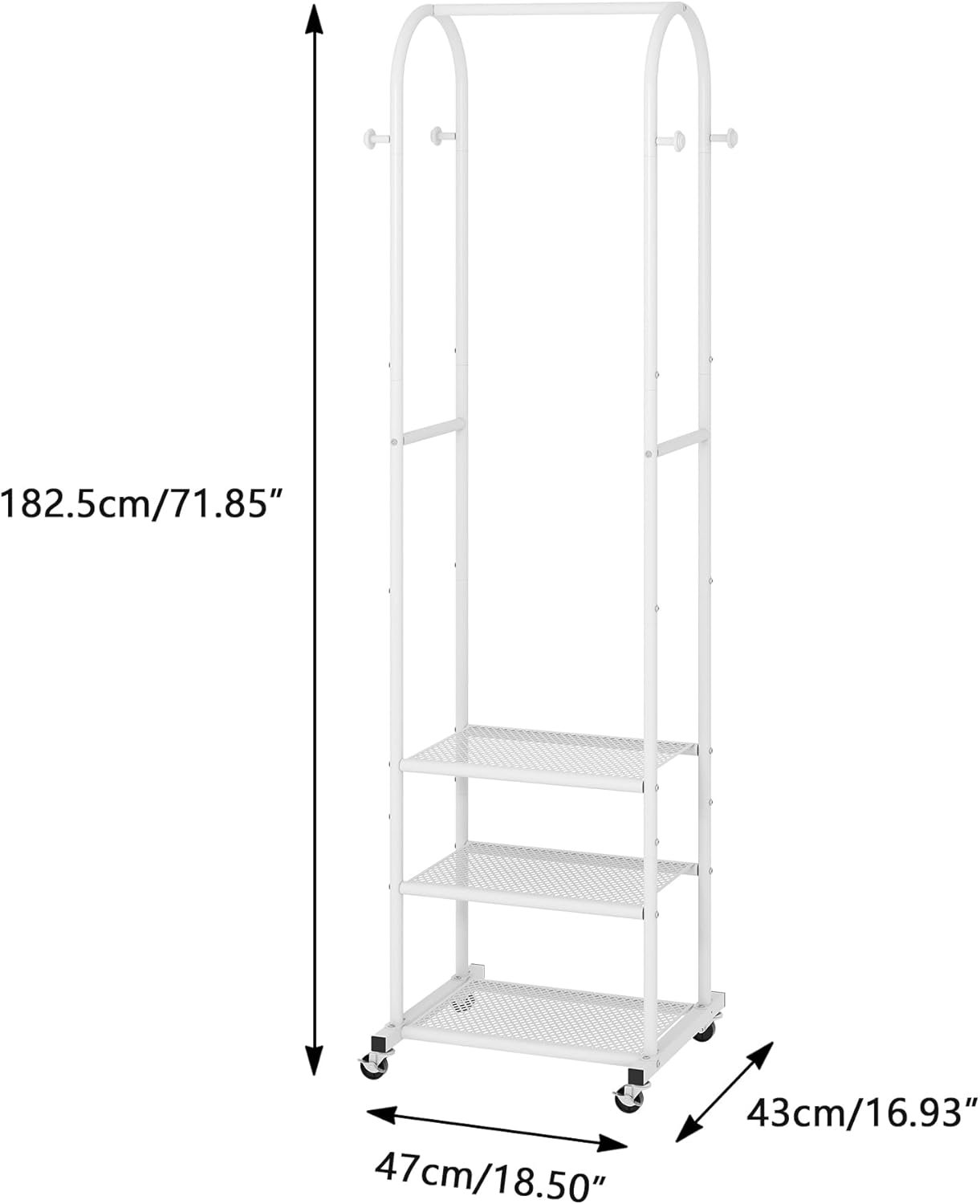 The Heavy Duty Clothing Rack is sturdy and stable and can be used to hang clothes.3 Metal Shelves to store folded clothes and shoes. There are also 4 hanging rods for hanging hats. The arched design is not only aesthetically pleasing, but also prevents clothes from falling off the sides.Perfect storage organization for anywhere,for laundry, for kitchen,for living room, for cloakroom, for bathroom