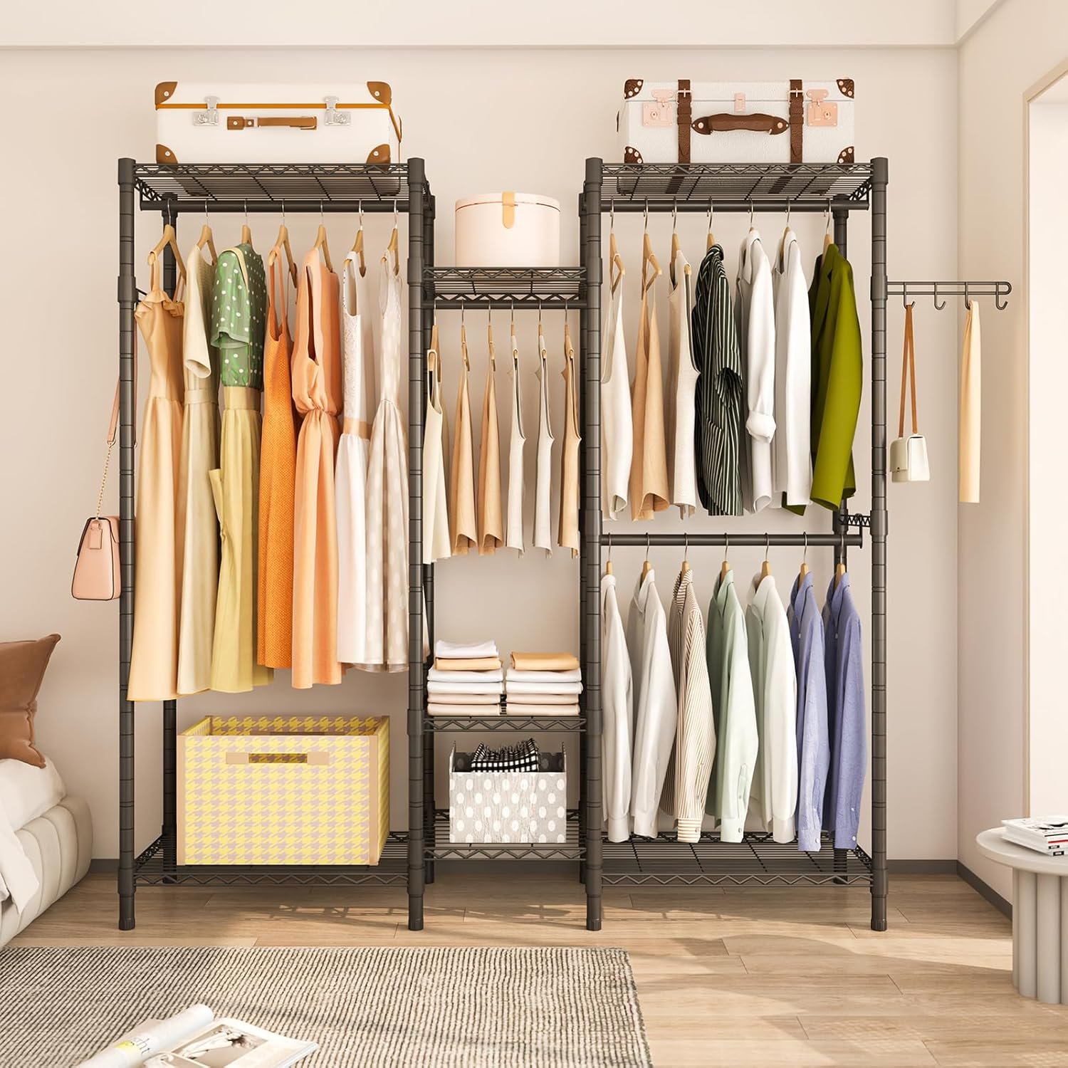 【Easy to Assemble】 The clothing storage closet shelves unit is easy to put together, can be finished during 30-45 minutes. We suggest two people install the garment rack, please watch the installation video guide before the installation, as certain shelves must be installed in a particular order