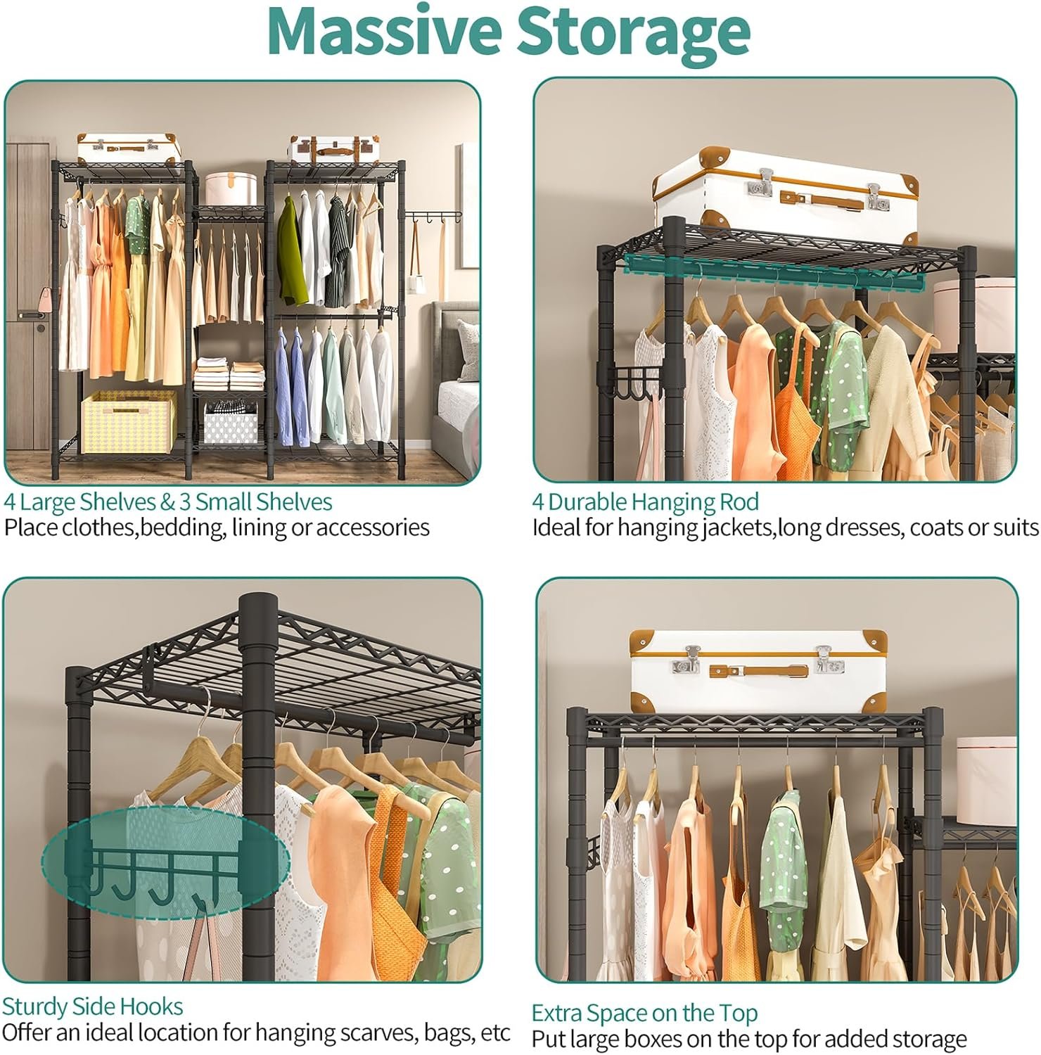 Adjustable garment rack, home storage helper! The heavy-duty clothes rack has 7 solid shelves and 4 hanging rods. Raise or lower the shelving for exactly what you need to create the Well-Organized wardrobe closet of your dreams.