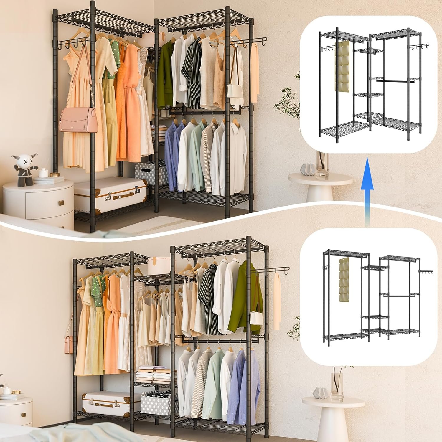 【Suitable for Various Spaces】 This clothing rack for hanging clothes has 3 main combination methods for varied size rooms. L shape & Horizontal shape & 2 separate clothing racks. You can put the portable closet rack almost anywhere, like corner, apartment, bedroom, clothing store, walk-in closet, cloakroom, laundry room, small closet, etc.