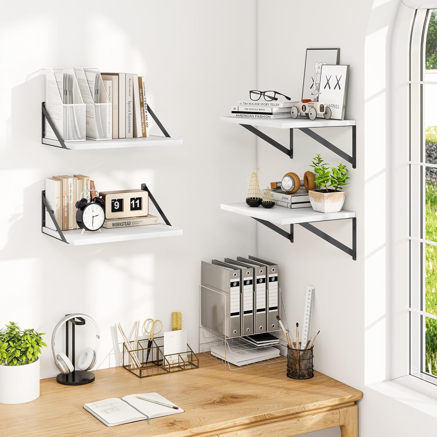 【12 inch Deep Floating Shelf】Our deep floating shelves set of 4 are 16″ long x 12″ deep. These deep wall shelves are wider and deep than regular shelves on the market, providing more room and worry-free storage! Supported by heavy duty triangular metal brackets, these wall shelves can hold up to 50 lbs.