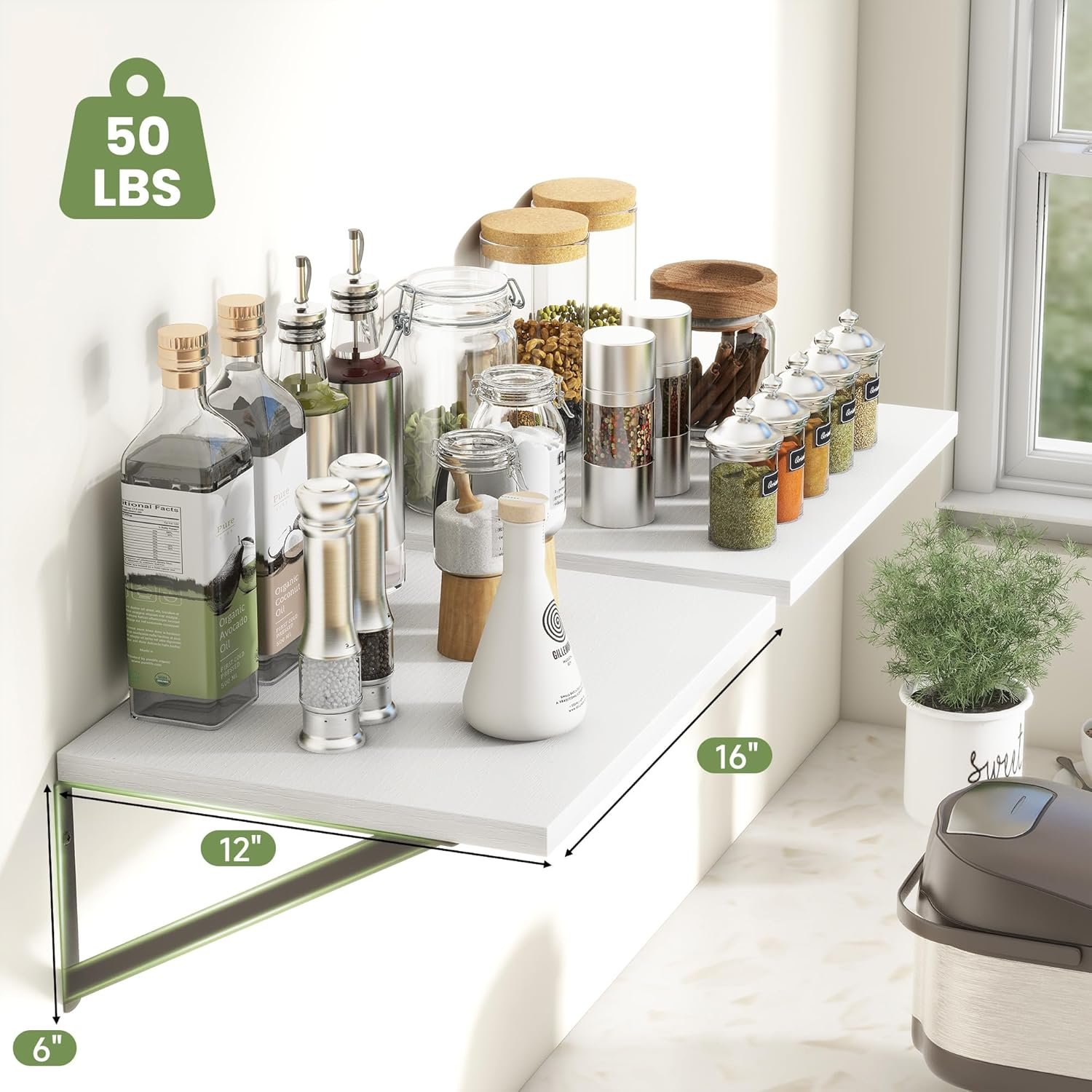 Heimlove 12 Inch Deep Floating Shelves for Wall, 16W x 12D Wide White Floating Shelves Heavy Duty Wall Mounted Shelves, Wood Shelves for Living Room Bedroom Bathroom Kitchen- Set of 4