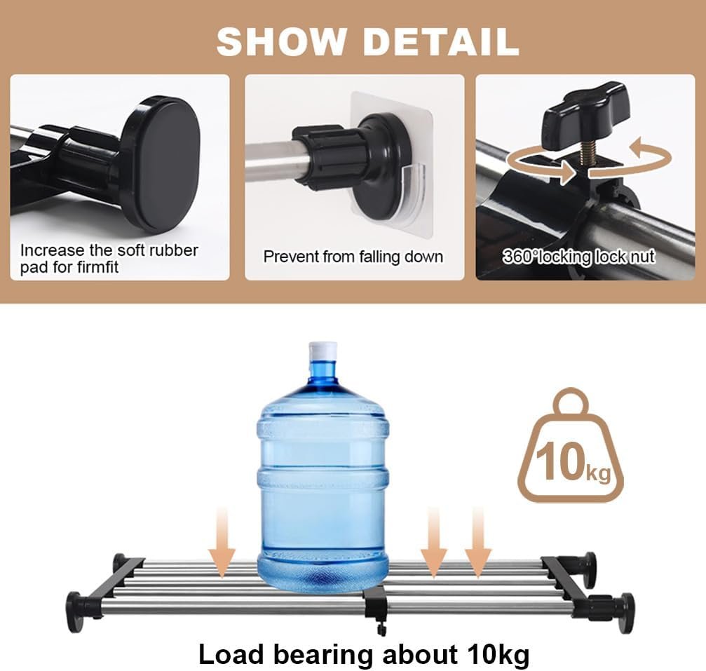 EASY TO INSTALL: No tools required, no damage to your decorative wall, adjustment to the length you want within the expandable range, then extend the suitable length, next tighten the screw, finally adjust fine-adjustment feet, shake the product and confirm that it is fixed, just select strong sides ,such as tiles, walls, wardrobes, etc.