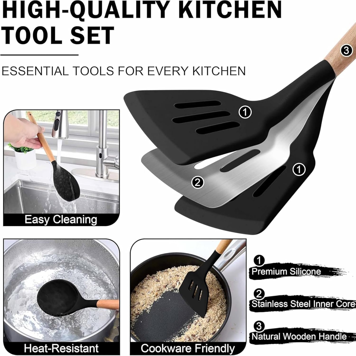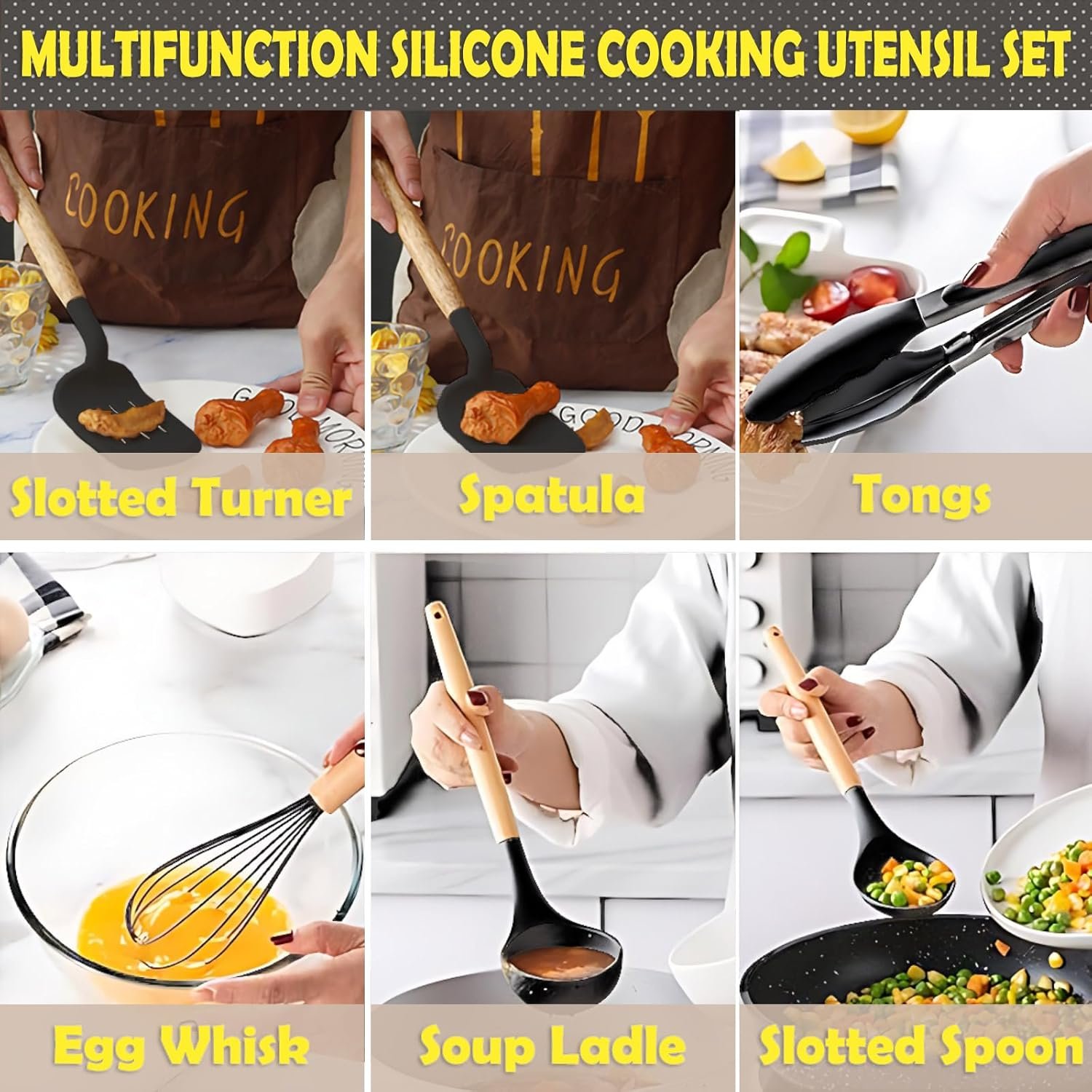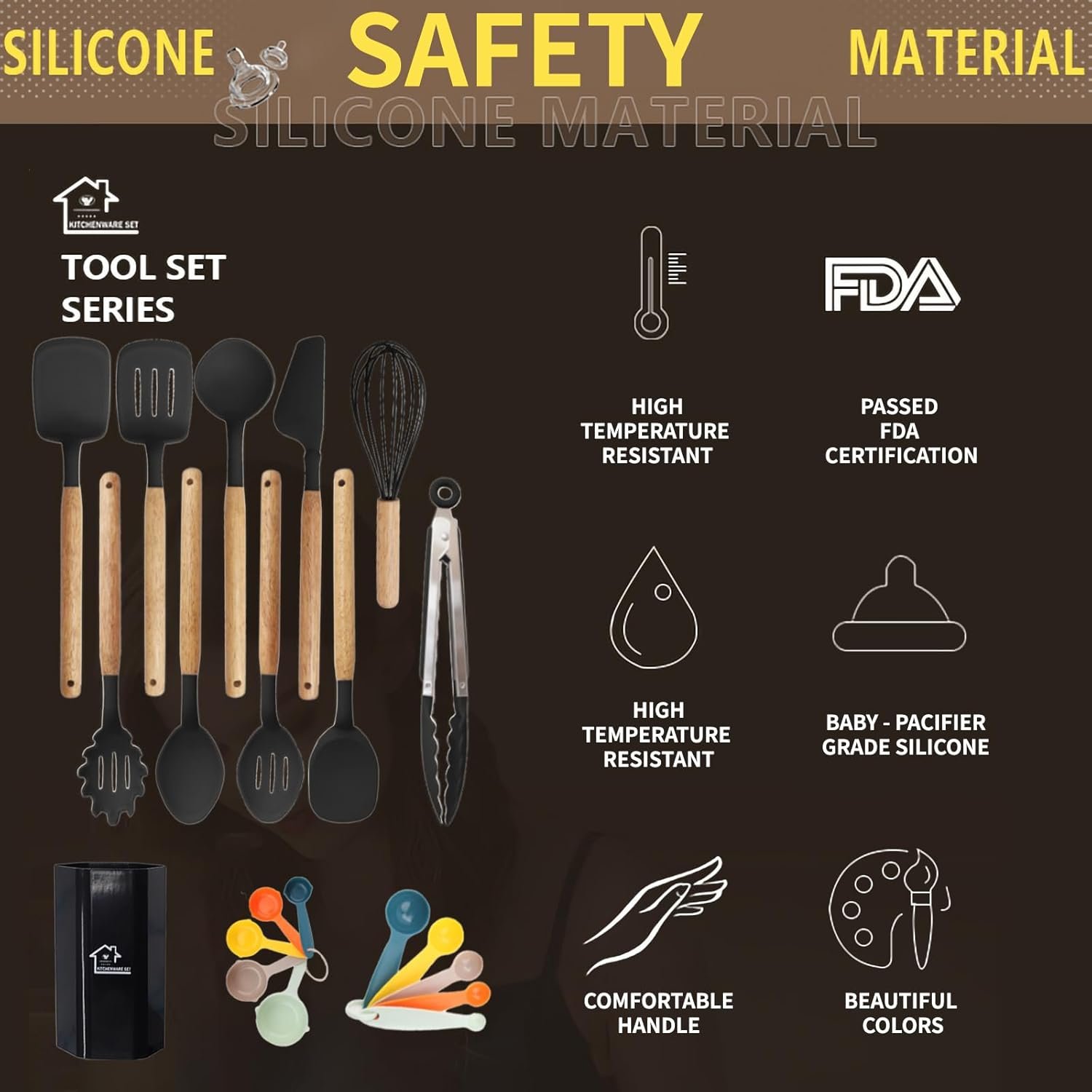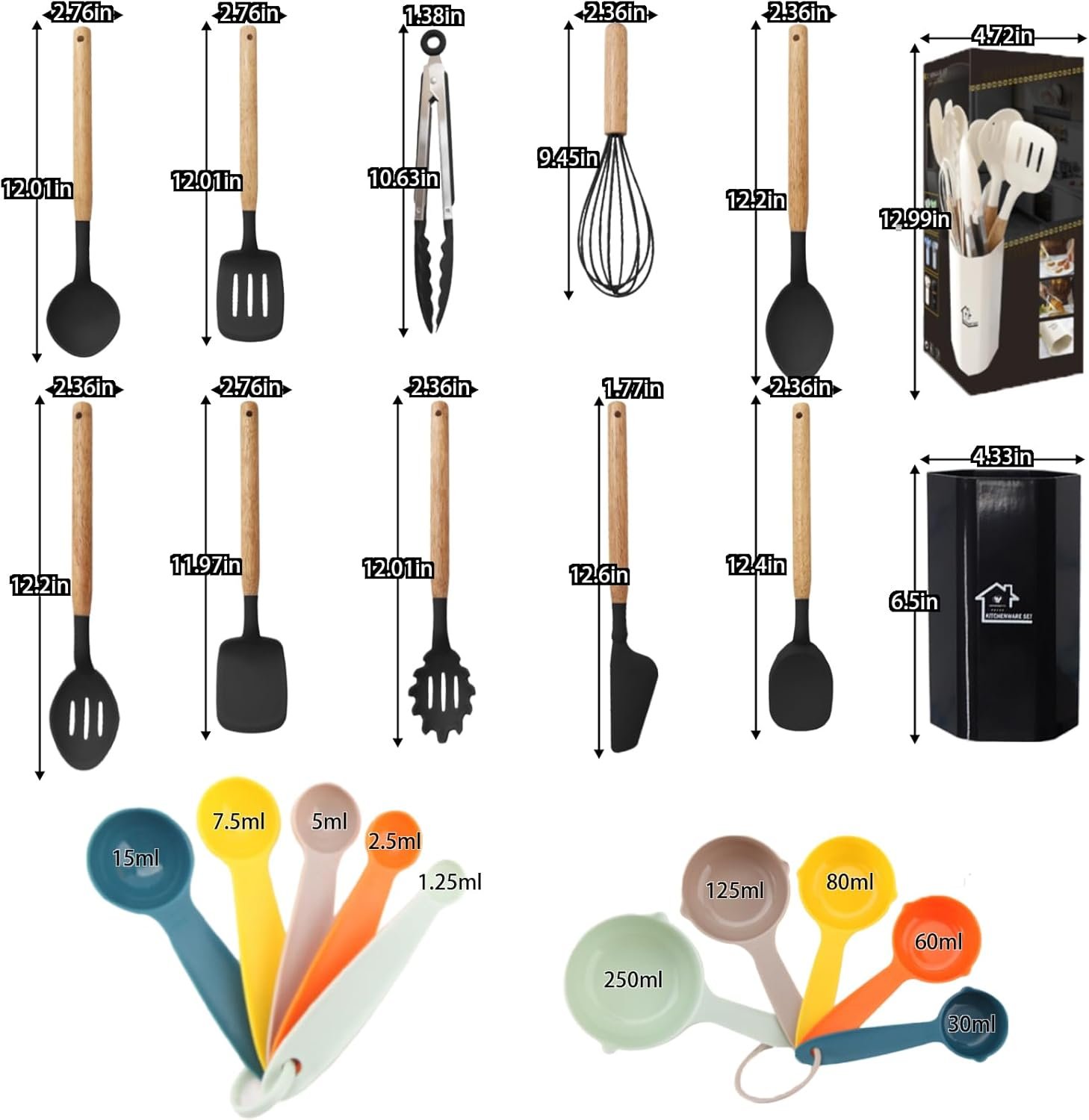 21 Durable Wooden Handel Kitchen Utensils Set: Anti scalding protect your hand from burning, 21 professional silicon Kitchen utensil set includeshe set includes Spoon, Spaghetti Scratch,Tongs,Slotted Turner, Brush,Whistle,Scissors and more. Meet your all kinds of kitchen needs, Because of the wooden handle, We don’t recommend soaking in water for a long time or dishwasher cleaning