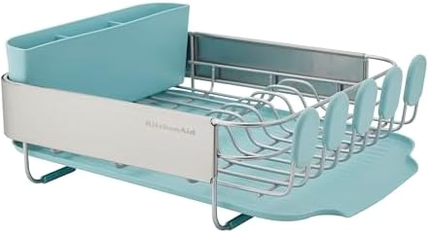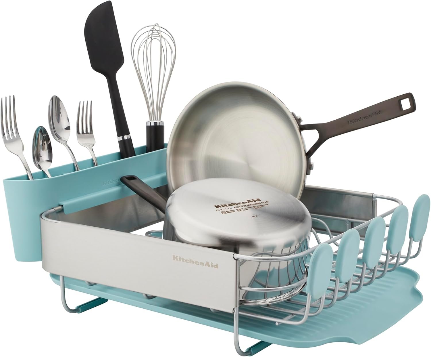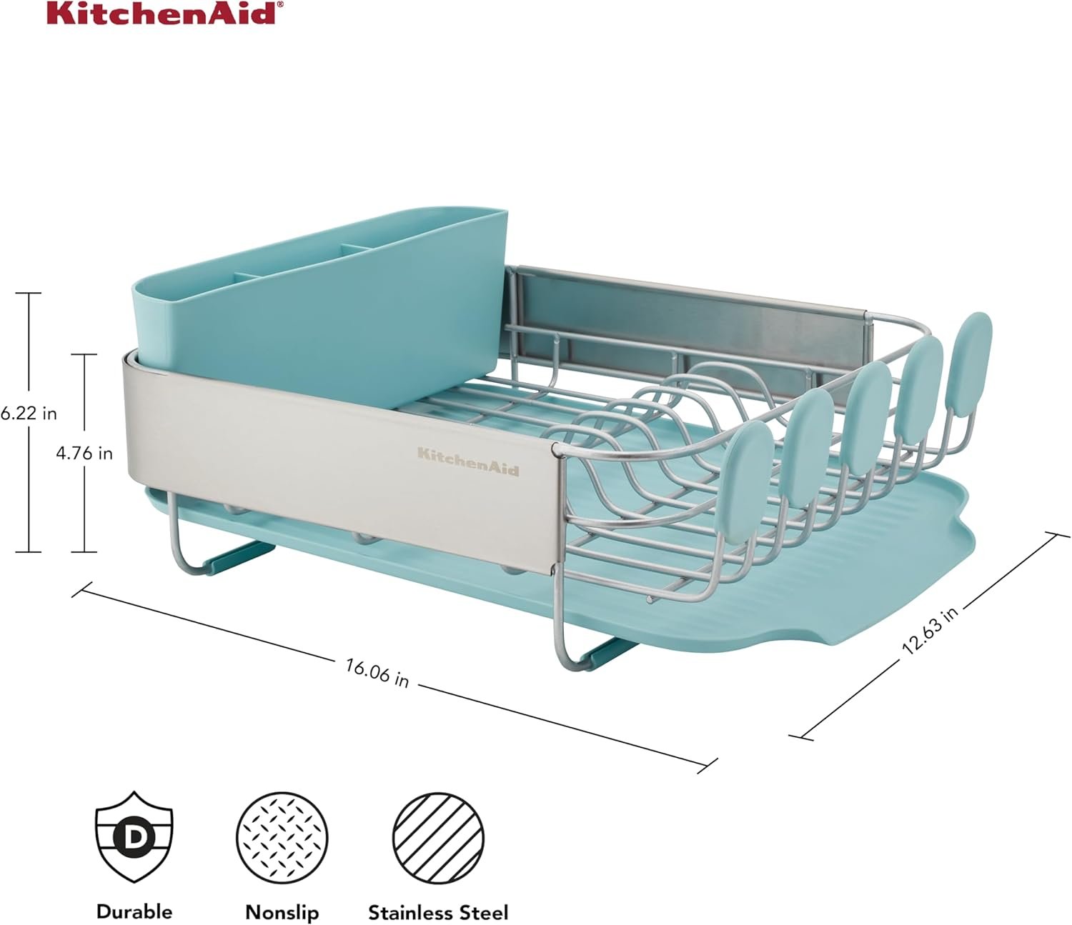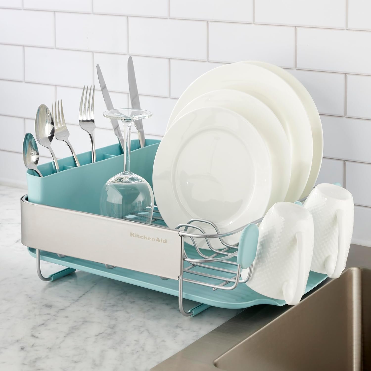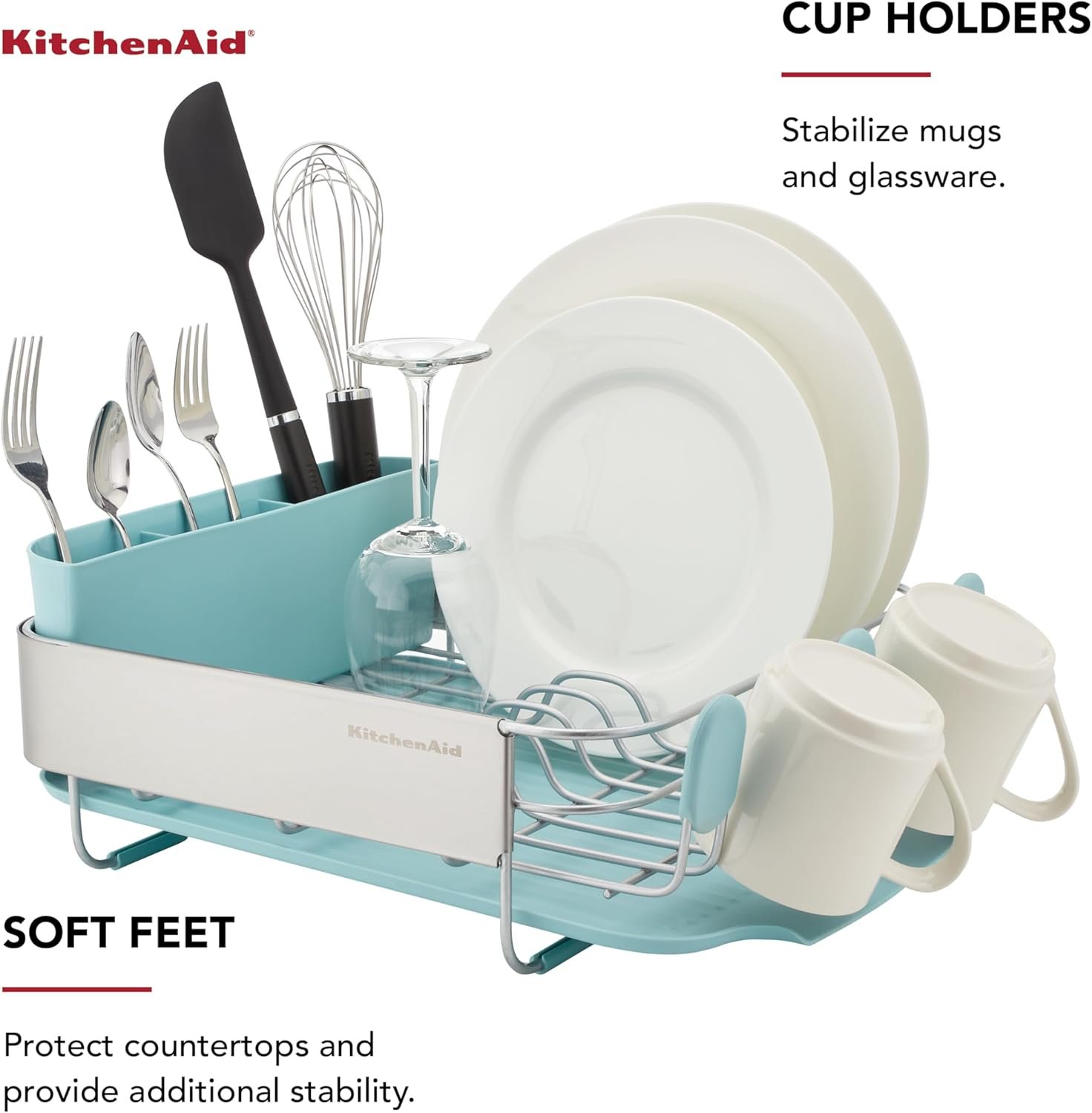 KitchenAid Compact Space Saving Rust Resistant Dish Rack with Removable Flatware Caddy and Angled Self Draining Drainboard, 12.63 x 15.87 x 5.54 Inch, Mineral Water