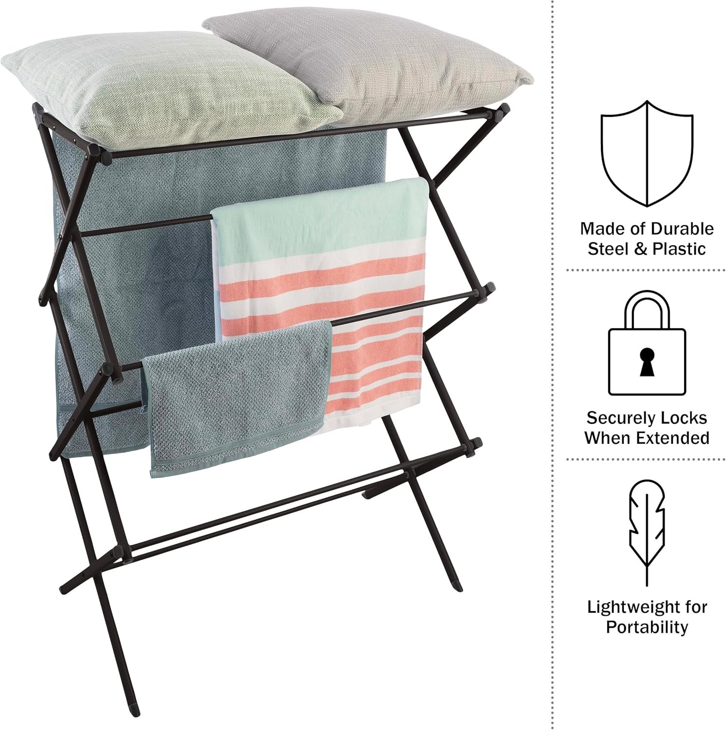 DURABLE AND LIGHTWEIGHT – Made of durable steel and plastic, this laundry dryer rack is designed to withstand the weight of wet clothes and locks when fully extended for extra sturdiness. The rack is also lightweight for convenient portability.