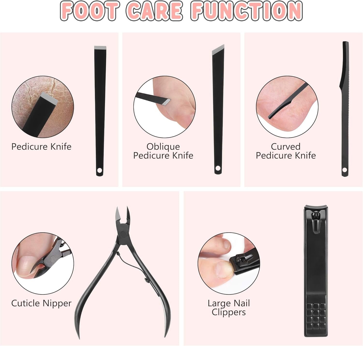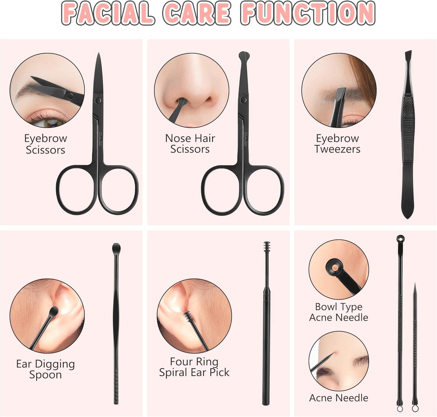 19pcs in 1 Grooming Kit – All tools you need in thisFacial Care Tools:Ear Digging Spoon: remove earwax from ear canalFour Ring Spiral Ear Pick: remove large chunks of earwaxEyebrow Scissors: trim eyebrowEyebrow Tweezers: shape up brows flawlessly by remove unwanted eyebrowAcne Needle: remove acneBowl Type Acne Needle: remove blackhead, acneNose Hair Scissors: trim nose hairsHand Care Tools:Medium Nail Clippers: trim finger nailsOblique Nail Clippers: trim nail thorns, the corner of nailsNail File: Make nails rounded, smoothNail Cleaner: clean dirt in nailNail Scraper: trim nail keratin and remove scrape nail polishV-Shaped Cuticle Trimmer: trim surface, calluses, dead skin, etcFeet Care Tools:Large Nail Clippers: trim hard and thick toenailsCuticle Nipper: cut off dead skin and spursCurved Pedicure Knife: pedicure, dead skin around the feet, etcPedicure Knife: clean dead skin, thick calluses of feetOblique Pedicure Knife: trim onychomycosis, dead skin between nails of feetCleaning Tools:Cleaning Brush: clean sharp tools, leather case