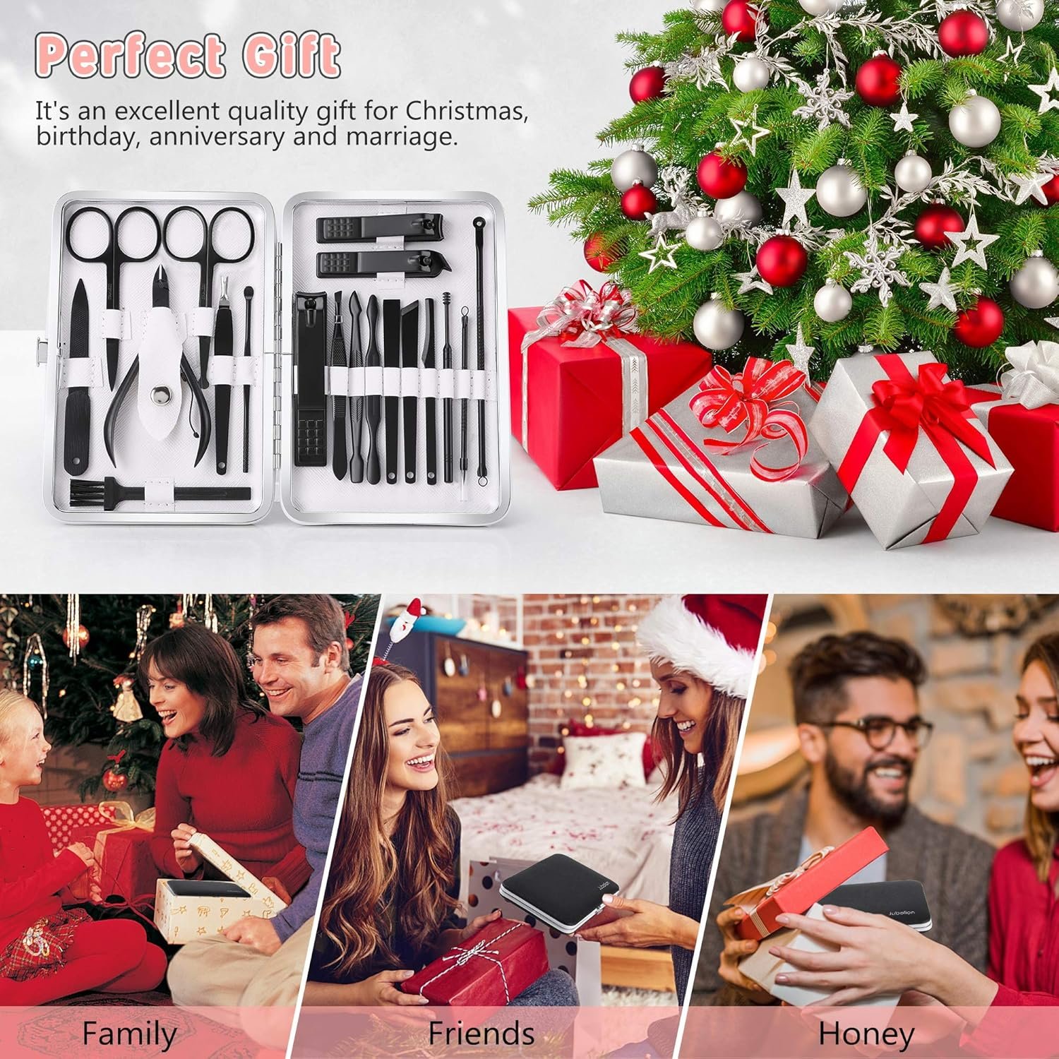 Why choice Jubolion Manicure Set?1. Curved knife edge fit nails, sharp and more comfortable.2. Non-slip design.3. Made of high-quality stainless steel, which is strong and durable.4. Travel nail kit combines 19 tools for daily beauty and nail care needs.5. It comes with a high-quality portable storage leather case.You Don’t Have to Spend a Fortune on a Manicurist to Keep Your Nails Pretty!