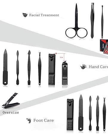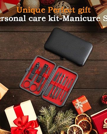 👍Inside the hinged case are ten manicure tools including a standard nail clipper, an angled nail clipper, a pair of scissors, a nail file, a pair of tweezers, an ear scoop and a nail pick.