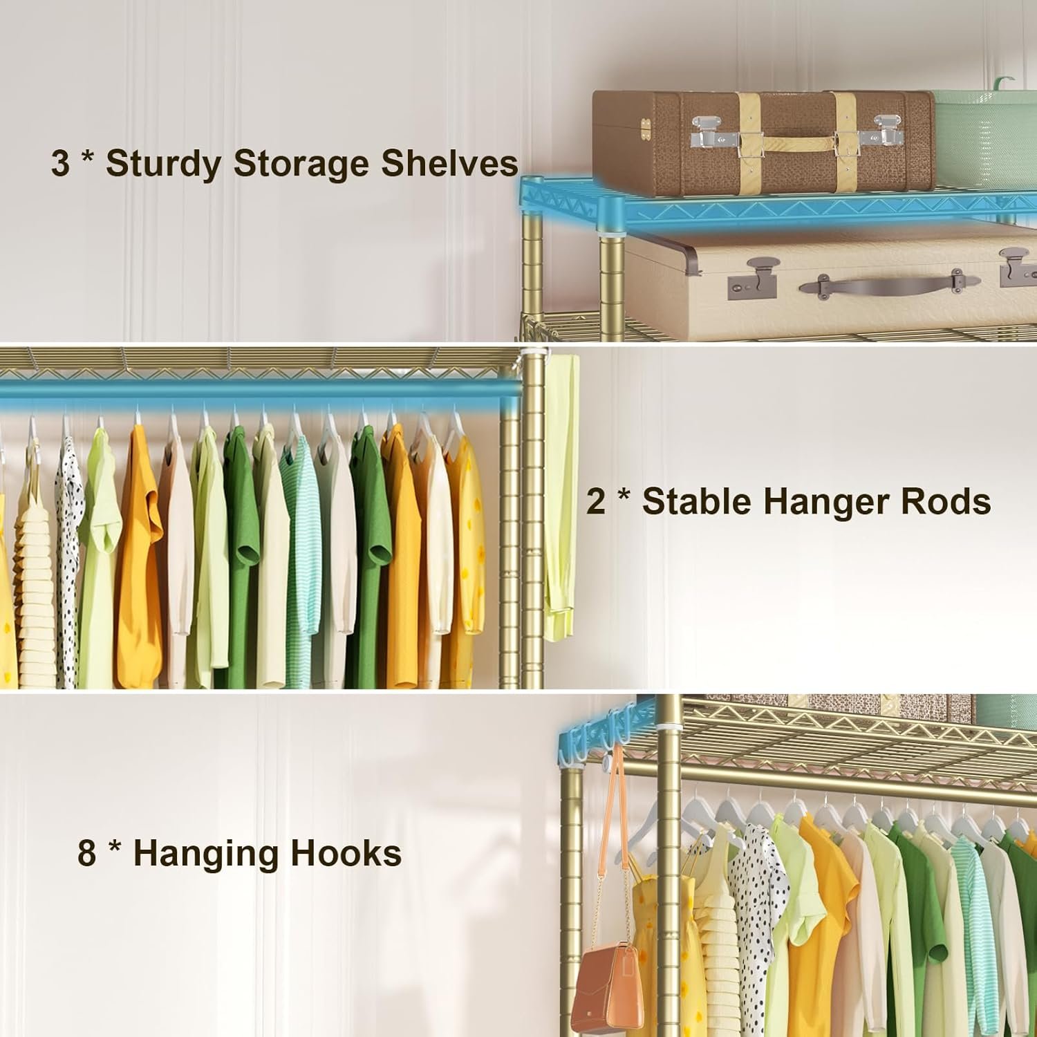 【Adjustable Shelves】Freestanding clothing rack features 3-tier adjustable height shelves and double hanging rods. The wire shelves can be adjusted up and down to accommodate various items you need to store, allowing you to easily maximize your storage space for coats, suits, dresses, shoes, hats, etc