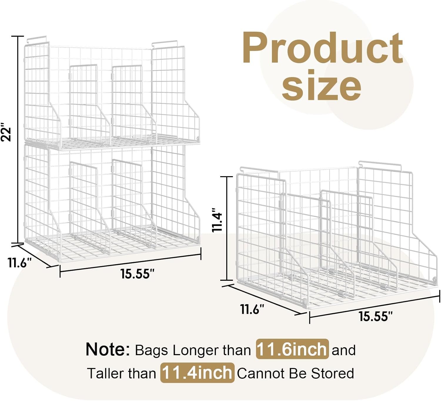 【Suitable for Various Bags】: The flexible design of stackable and adjustable dividers in the bag storage basket accommodates a wide range of bag types. Regardless of the shape, size, or material of the bags, they can be effectively placed and organized. This includes handbags, shoulder bags, crossbody bags, wallets, and more. Note: Bags with a length exceeding 11.4 inches and a height higher than 9.8 inches cannot be stored.