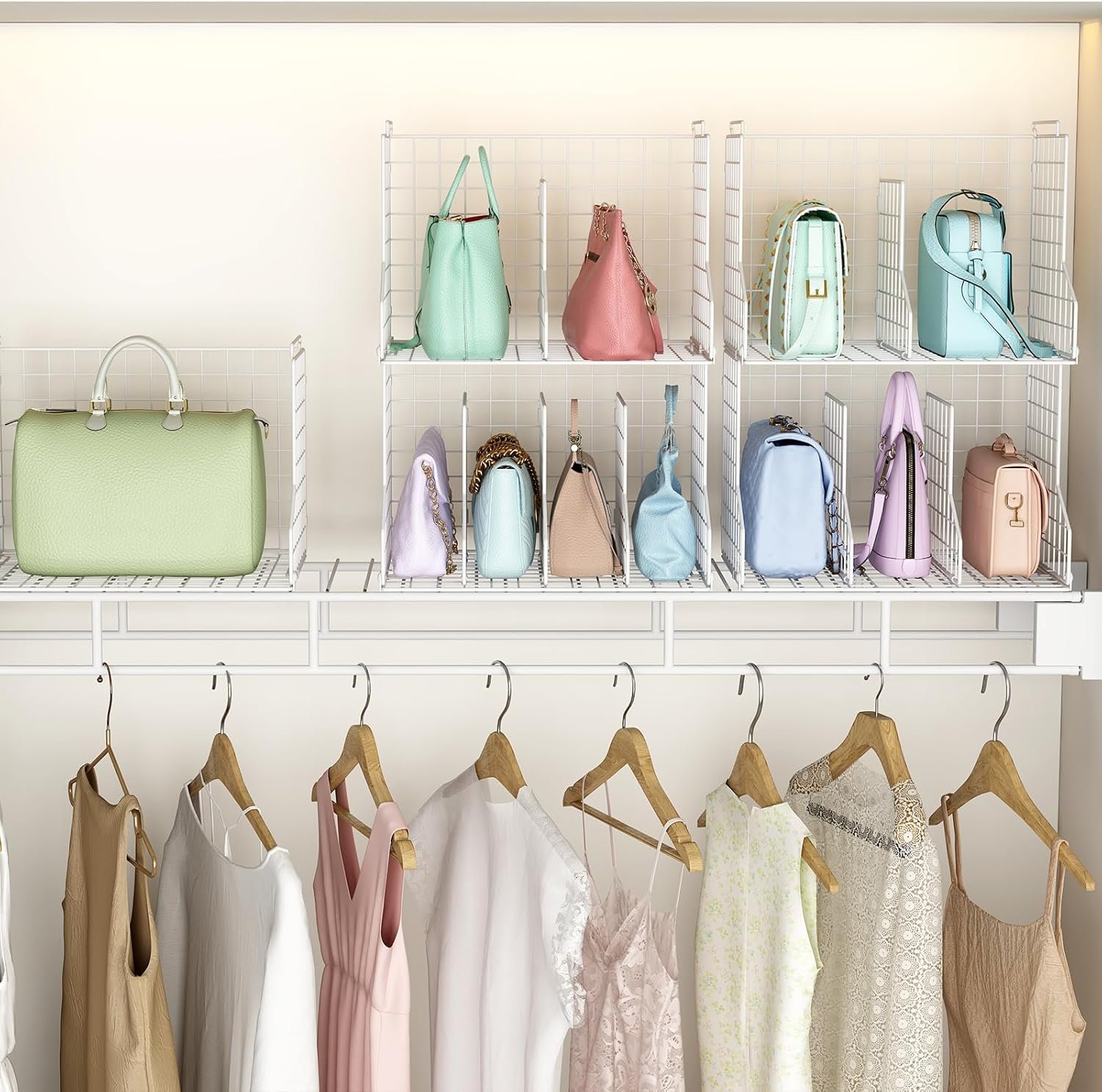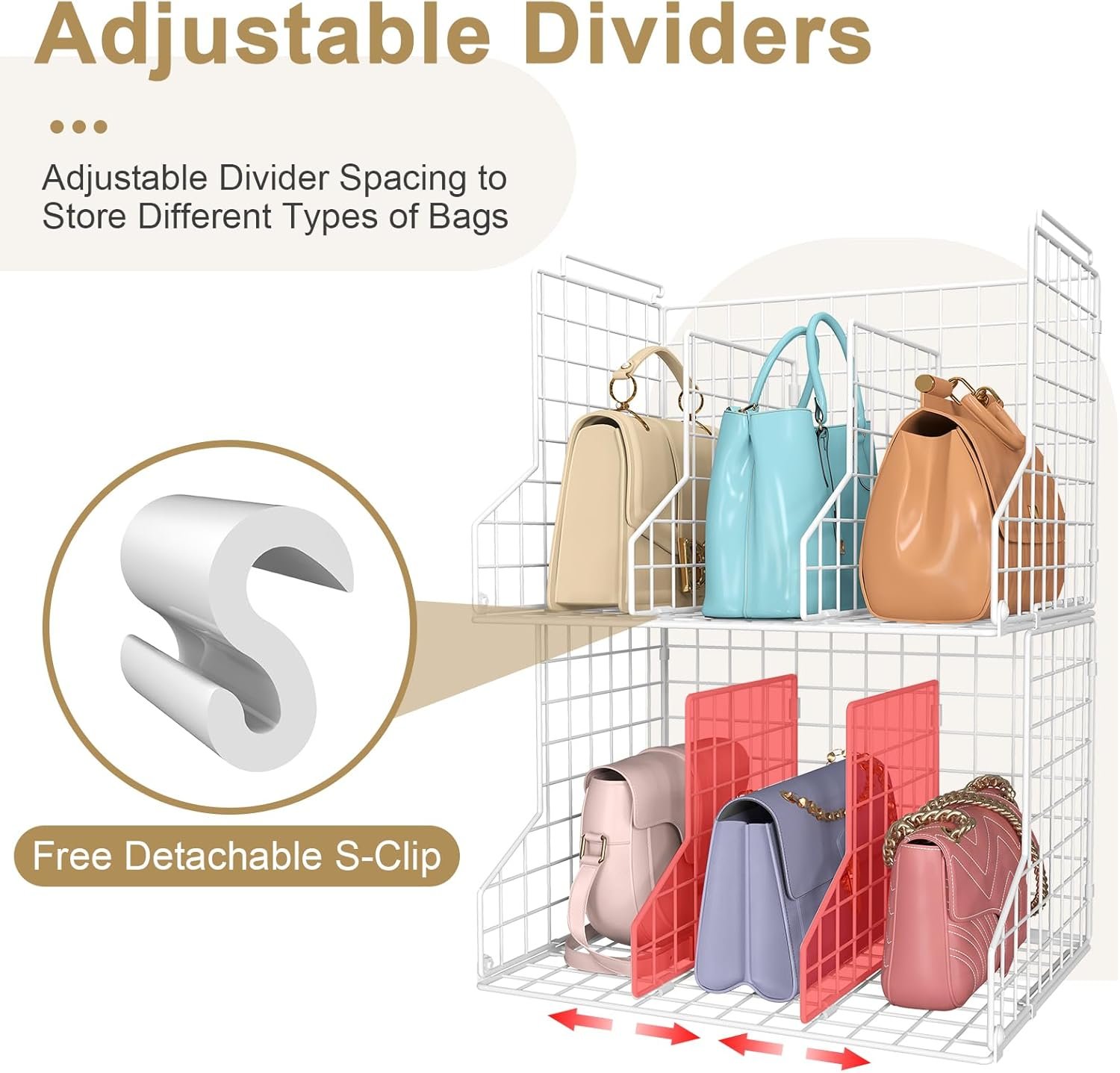 【Convenient and Quick】: With this wallet organizer, you can adjust the stacking layers and divider positions as needed, achieving a diverse bag storage arrangement. You can easily see the position of each bag and quickly find the bag you need. You can place it on the shelves of your wardrobe or coat rack for bag storage.