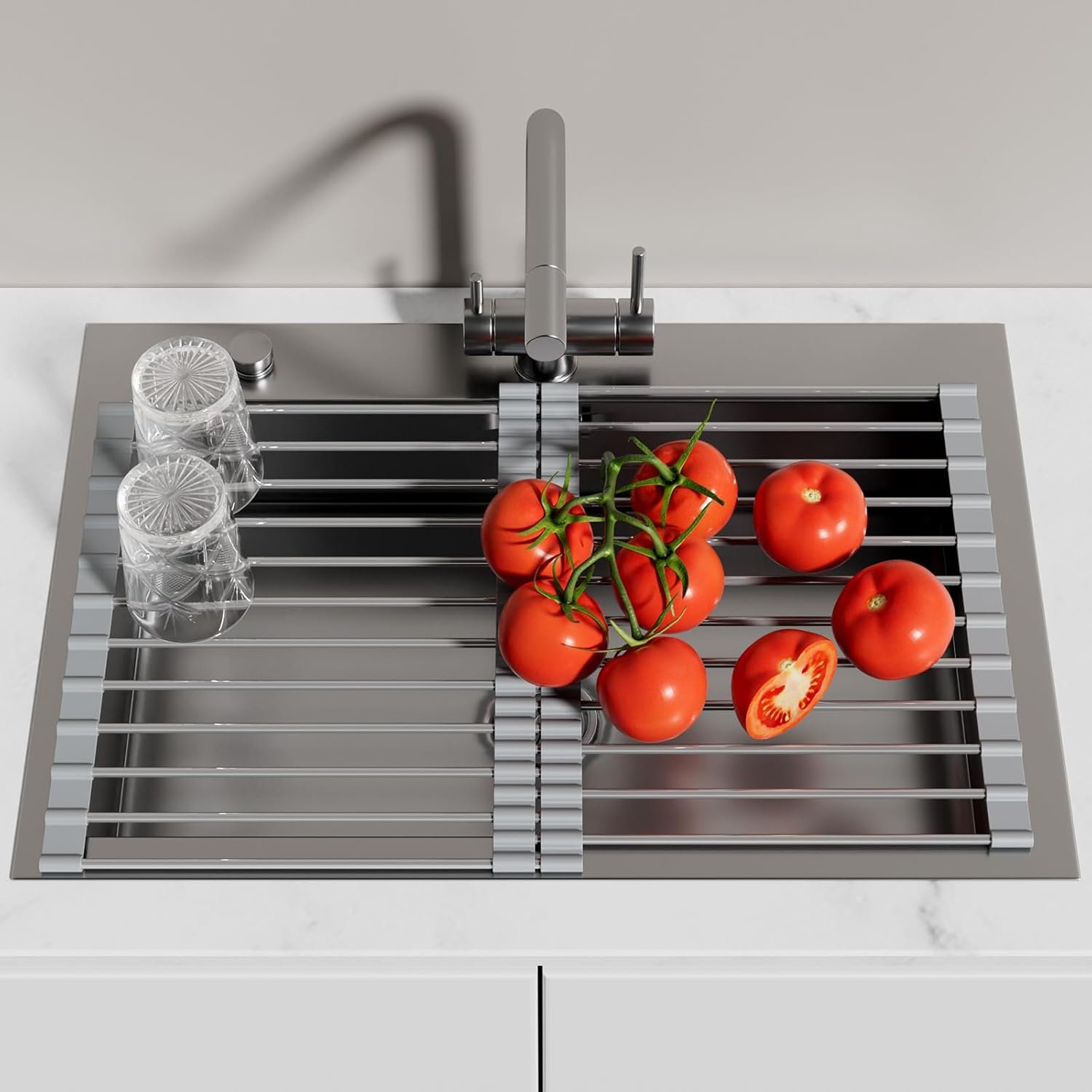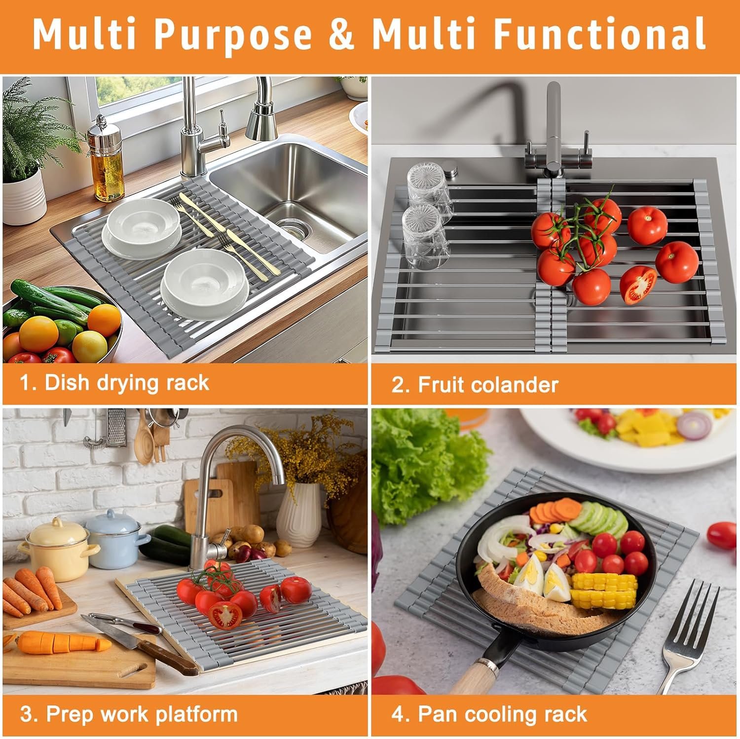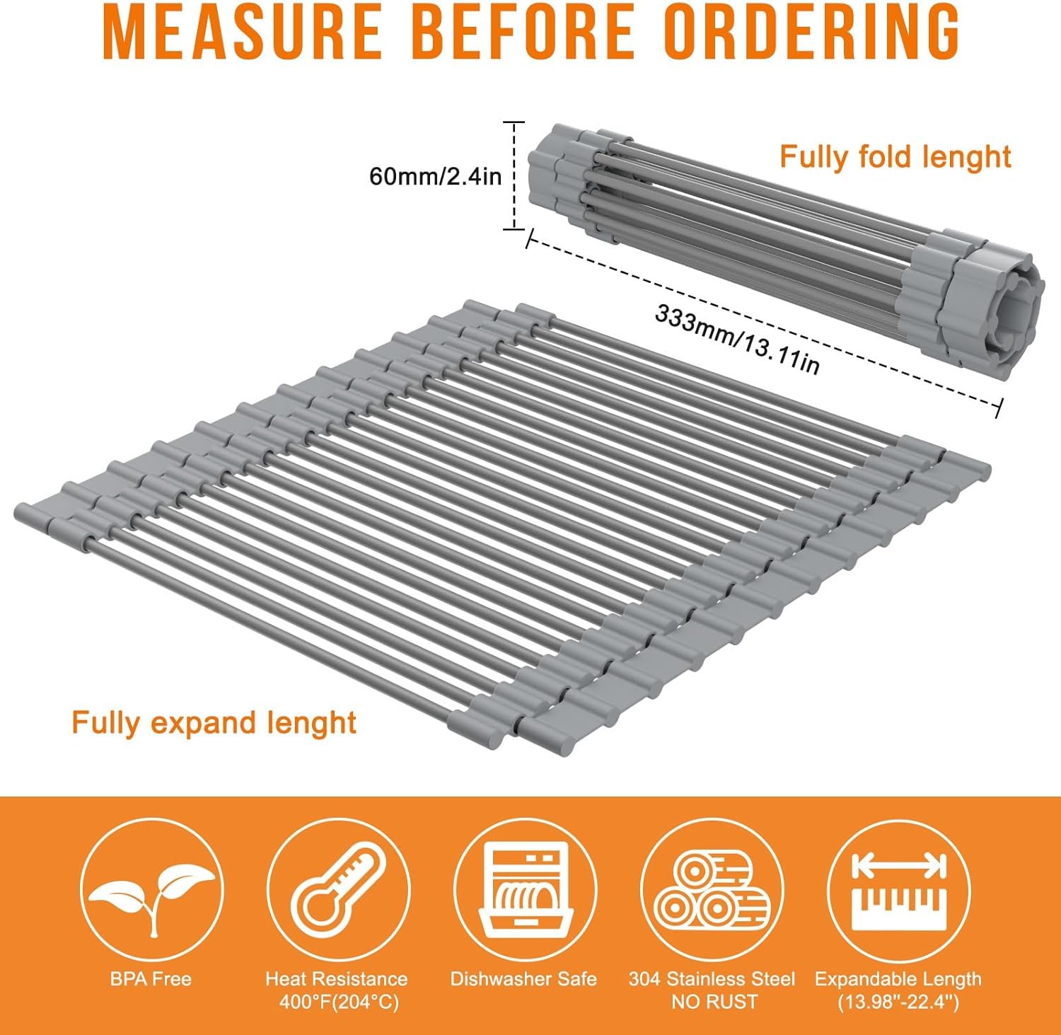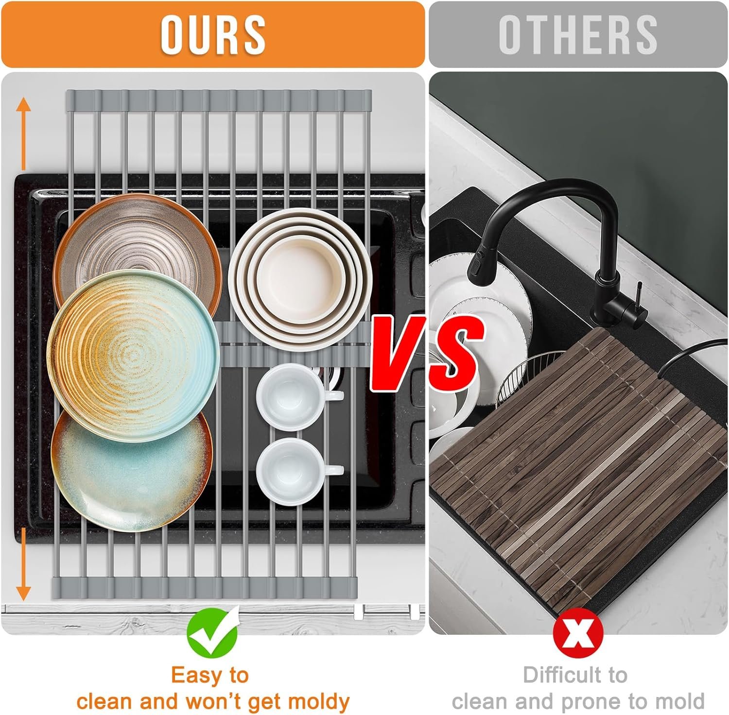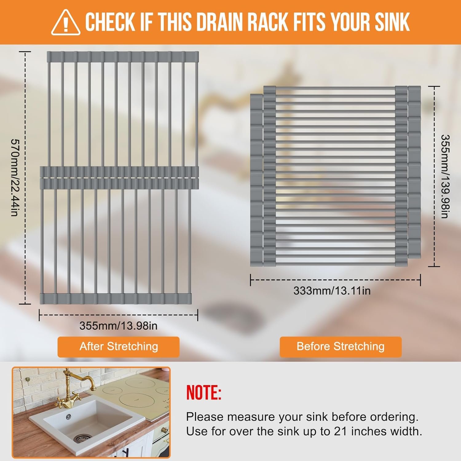 Space Saving & Easy to Store: This expandable dish drying rack sits over the sink, freeing up your counter space while allowing water to drip directly into the sink. It rolls up easily for storage when not in use, keeping your sink and kitchen counter neat and organized. This over-the-sink drying rack is the perfect partner for kitchen organization and storage!