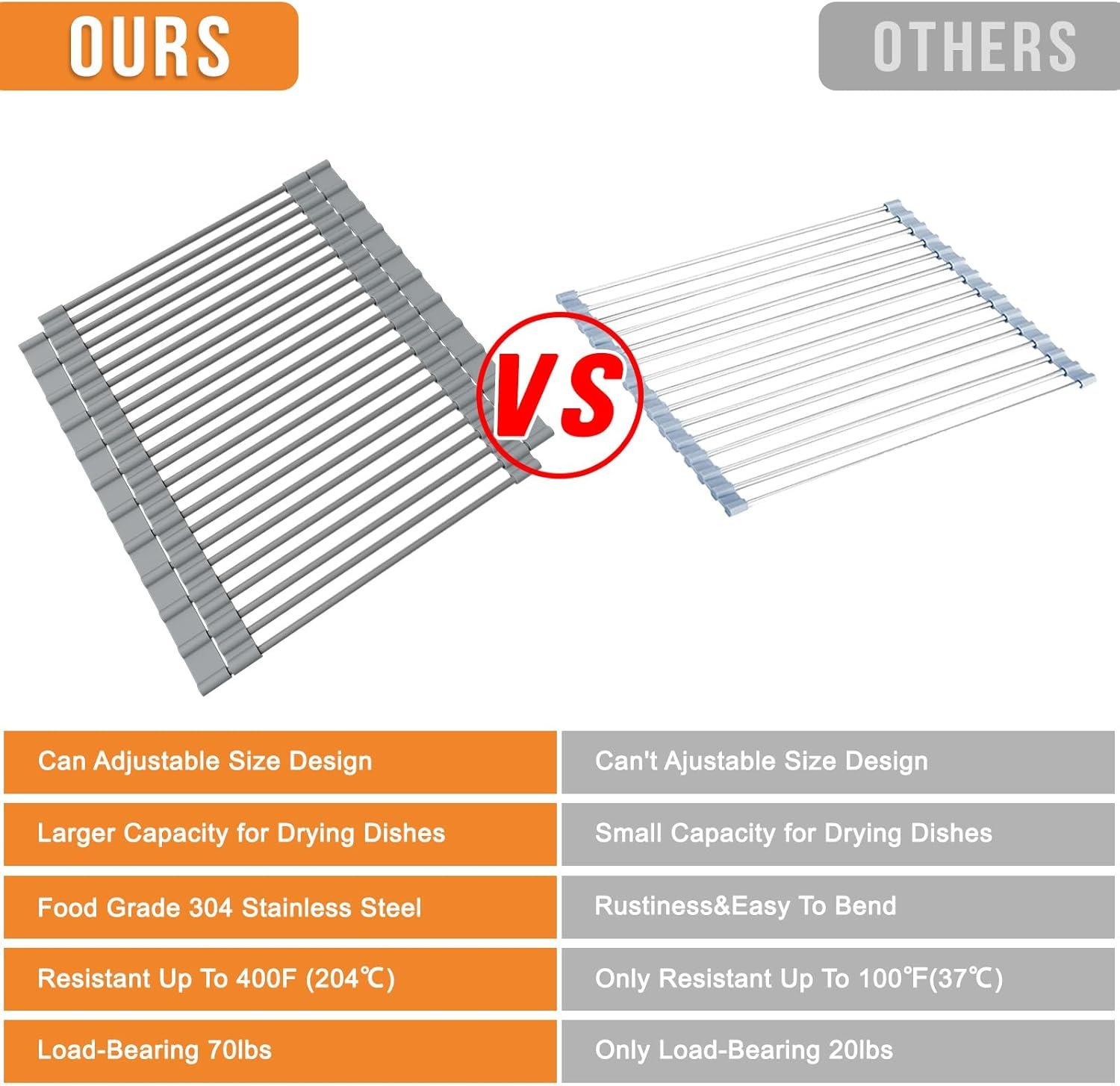 Premium Quallty: Made of high-quality steel rods covered with silicone, our roll up dis drying rack is sturdy, rust-resistant, and non-slip. It is strong enough to support 44 lbs without bending or breaking by heavy cookware.