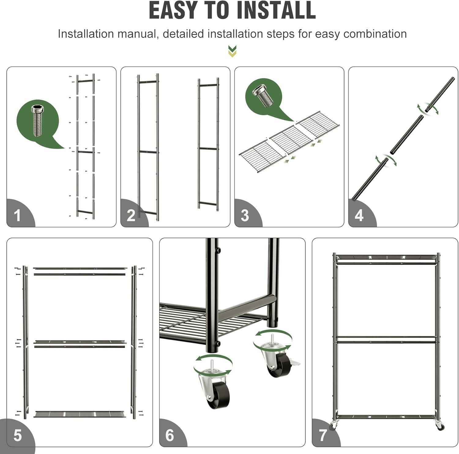 🚀 【Easy Mobility and Stabilit】y: This rolling clothes rack is equipped with four wheels, two of which can be locked to ensure it stays in place when needed. This feature allows you to easily move and securely position the portable clothes rack wherever you need it.