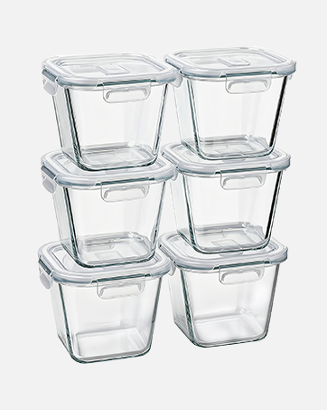 Space-Saving Stack Design: Square glass storage containers with lids organize pantry snacks, fridge meal prep, or freezer soups while saving cabinet space