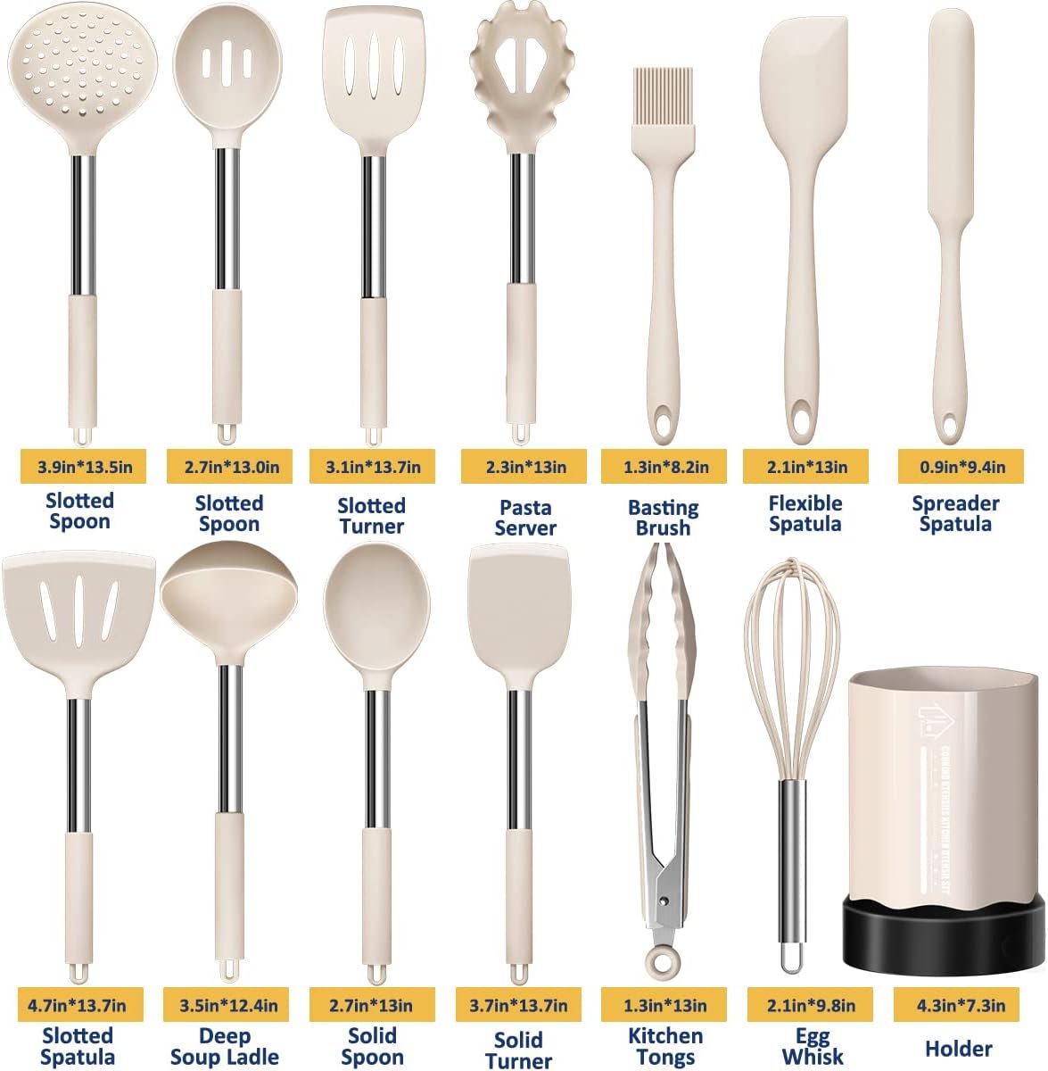 Easy To Clean: With stainless steel core never warp. One-piece molding without any gaps to capture food. Make cleaning easier. comparing to the cheap plastic kitchenware, it doesn’t retain odors or colors when you use it for stirring deep-colored food.It’s a great gift for anyone who loves to cook, a nice gift set for your friend’s/family’s house warming party/wedding party