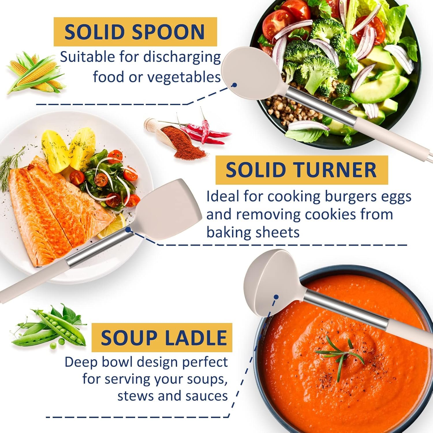 Heat-Resistant & Avoid the Melt: The Silicone Cooking Utensils can withstand high temperatures up to 446°F/230°C. All-around silicone added to the softness, no longer worry food will stick your cookware. Silicone head protect your pans, keep the cookware surface not scratched or dented. Extend the life of all your kitchen pans