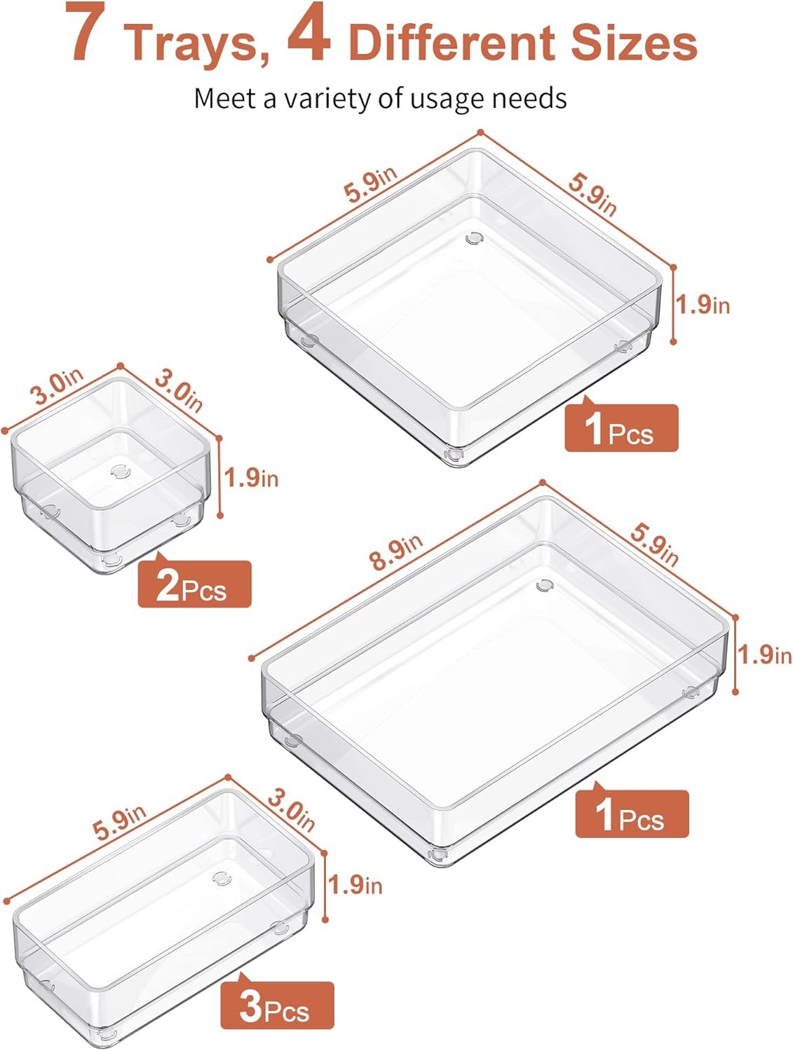 Clear & Durable at a Glance- Made of sturdy PS plastic, each makeup drawer organizer is resistant to cracking or warping. The transparent design lets you quickly identify contents at a glance—ideal for busy mornings or work routines.