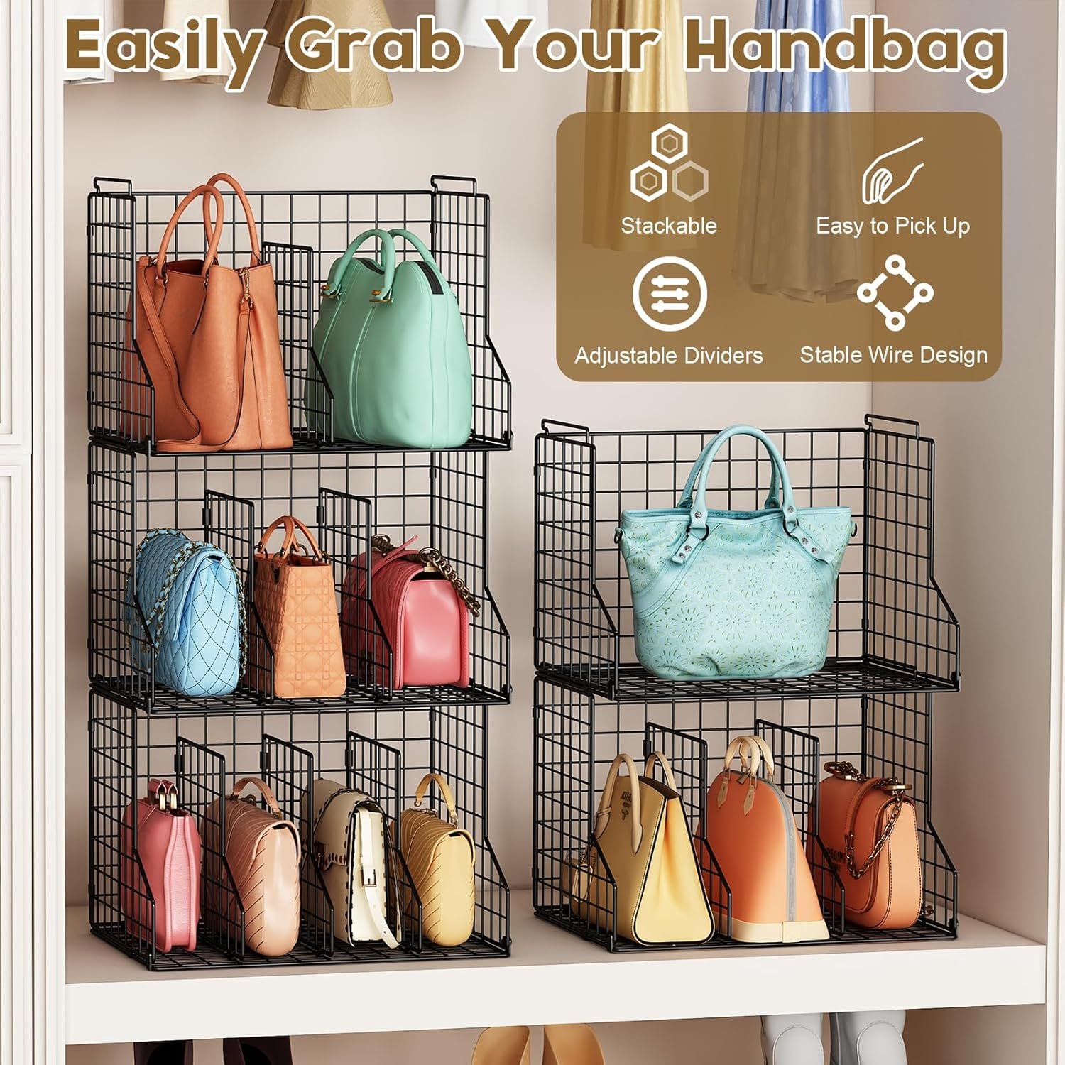 【Suitable for Various Bags】: The flexible design of stackable and adjustable dividers in the bag storage basket accommodates a wide range of bag types. Regardless of the shape, size, or material of the bags, they can be effectively placed and organized. This includes handbags, shoulder bags, crossbody bags, wallets, and more. Note: Bags with a length exceeding 11.4 inches and a height higher than 9.8 inches cannot be stored.