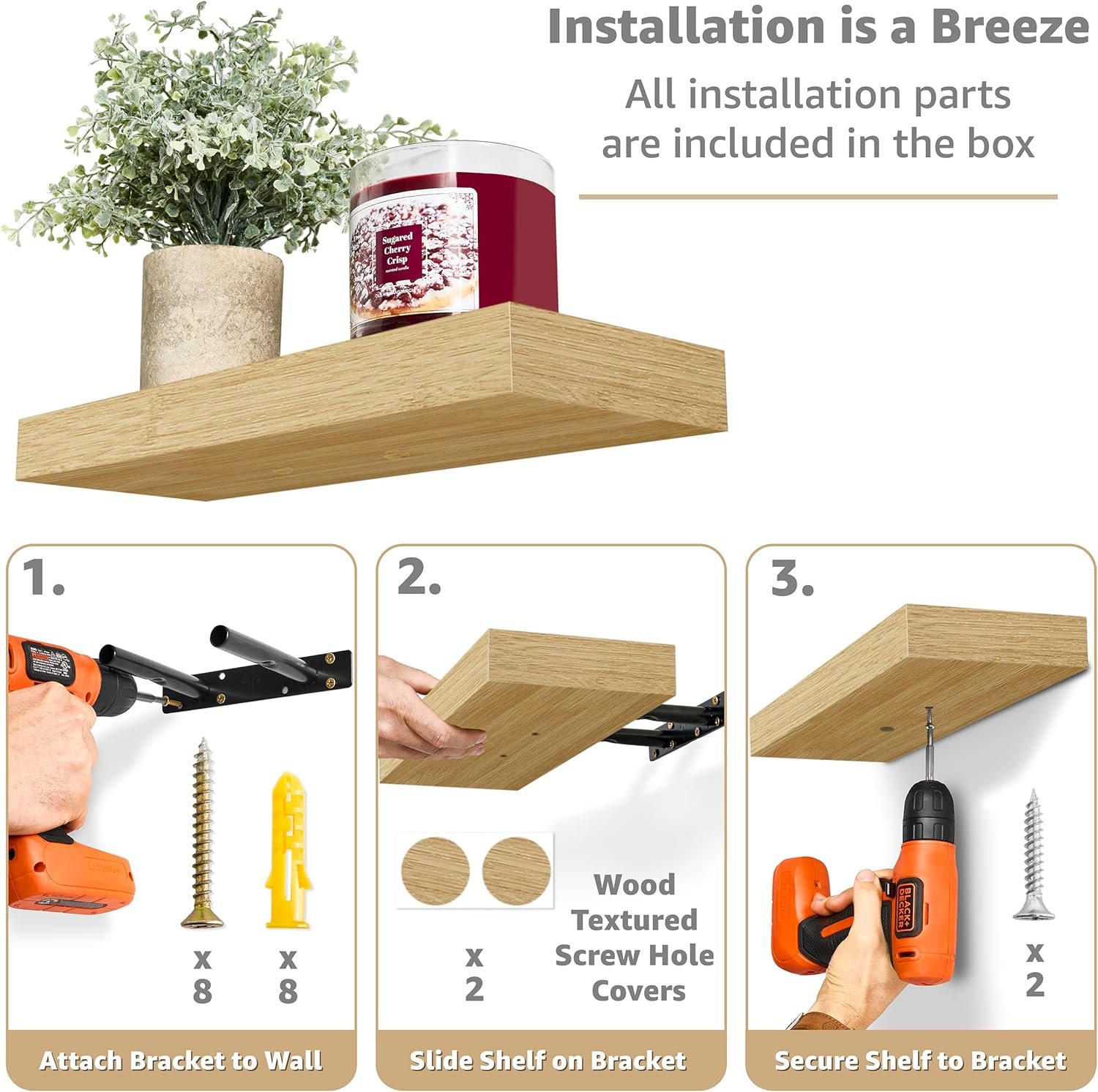 Easy Installation: Mounting hardware INCLUDED. Hanging shelves are made of beautiful MDF with PVC + bracket. Attaches firmly to the wall. Minor assembly is required. Supports up to 22 pounds per shelf. Measures approximately 16.25 in L x 5.50 in W. Each display shelf 1.5 in thick