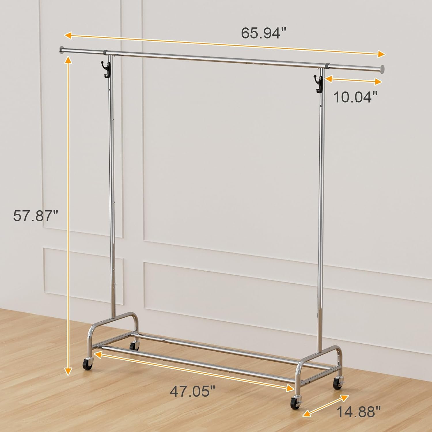 【Sturdy & Large Capacity】Crafted from heavy-duty 20mm diameter chromium-plated steel, this heavy duty clothes rack offers exceptional durability and load-bearing strength. The chrome finish resists rust and corrosion, making this chrome garment rack a reliable partner for organizing and storing a large number of clothes, coats, and garments.