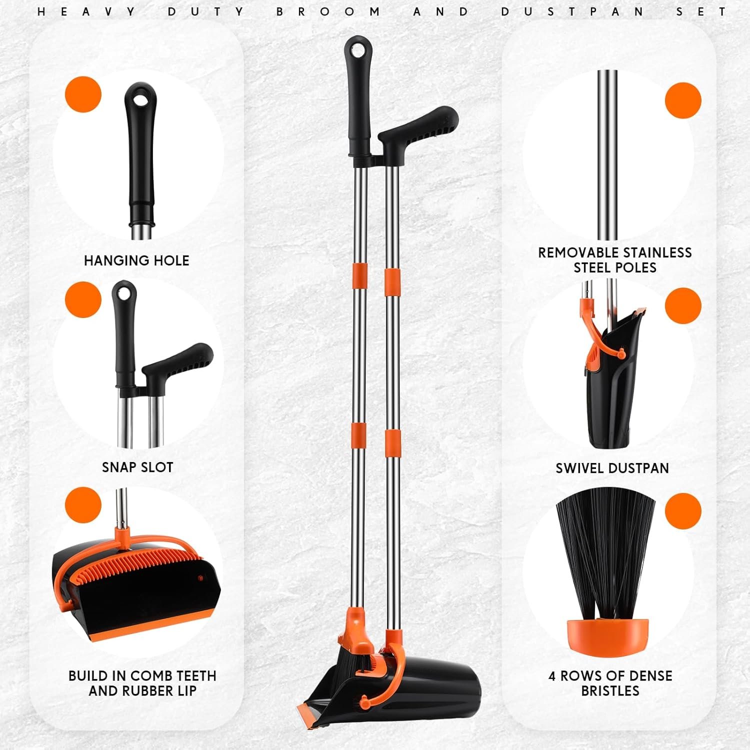 Heavy Duty Broom with Dustpan Set: this outdoor broom and dustpan set is a necessary tool for your home or office; The set includes 3 heavy duty brooms and 1 dustpan, made from sturdy plastic and stainless steel; In black and orange, this cleaning gadget is suitable for both indoor and outdoor use, such as in your garage, kitchen, office, or hall