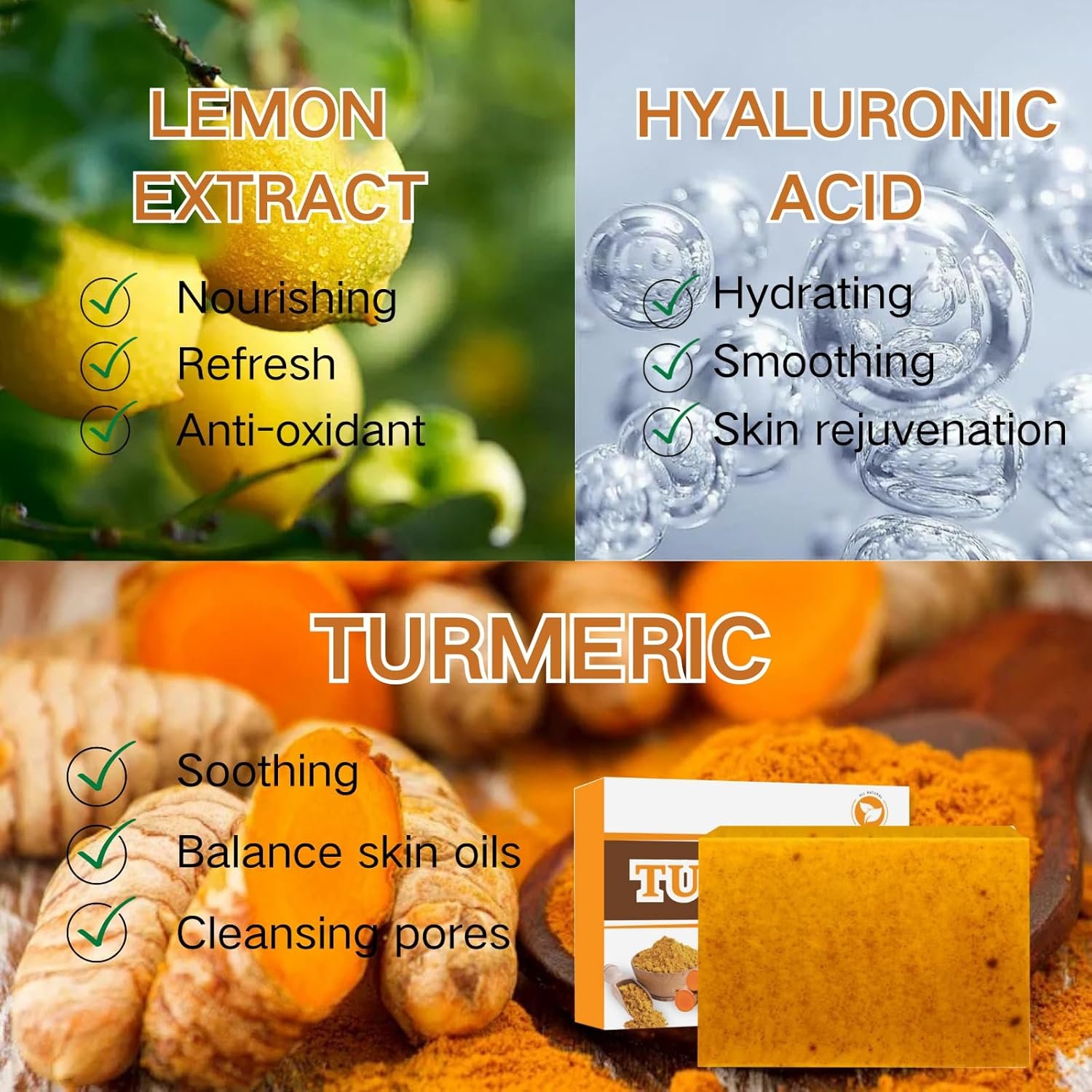 Natural Formula:Our hydrating lemon turmeric bath soap bars consists of plant extracts to create low-irritant, non-comedogenic skincare formulae .Make sure this turmeric ko-jic a-cid cleansing soap are suitable for all skin types. And the lemon turmeric ko-jic a-cid soap is a gentle and effective option for those seeking a more natural approach to skincare.