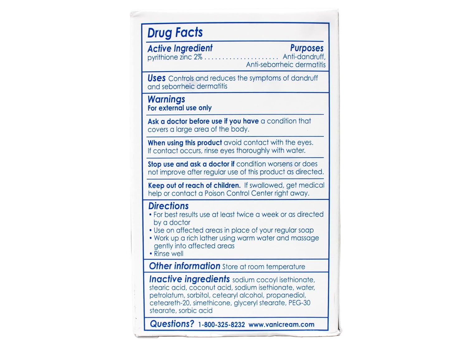 Vanicream Z-Bar Medicated Cleansing Bar is a dermatologist-tested formula containing 2% Pyrithione Zinc, known to help relieve itching, redness, flaking, and scaling associated with seborrheic dermatitis and dandruff. This gentle, soap-free, and gluten-free cleansing bar is free of dyes, fragrances, masking fragrance, lanolin, parabens, and formaldehyde releasers, making it ideal for sensitive skin. Its non-comedogenic formula won’t clog pores, and it can be used on the face, hands, body, and scalp. Manufactured in the USA by Pharmaceutical Specialties, Inc., this medicated cleansing bar provides a mild yet effective cleanse. Net Wt. 3.5 oz (99 g).