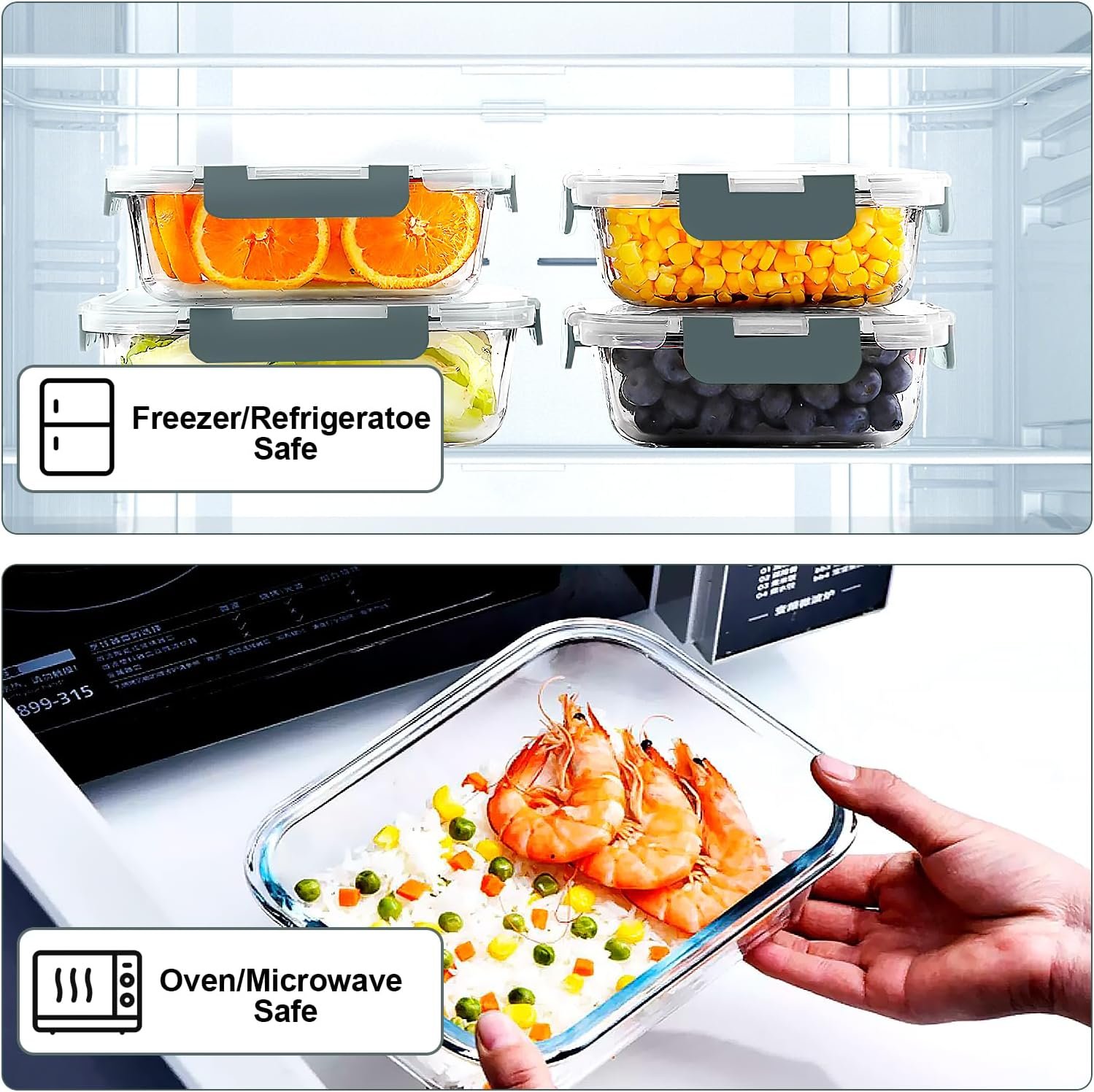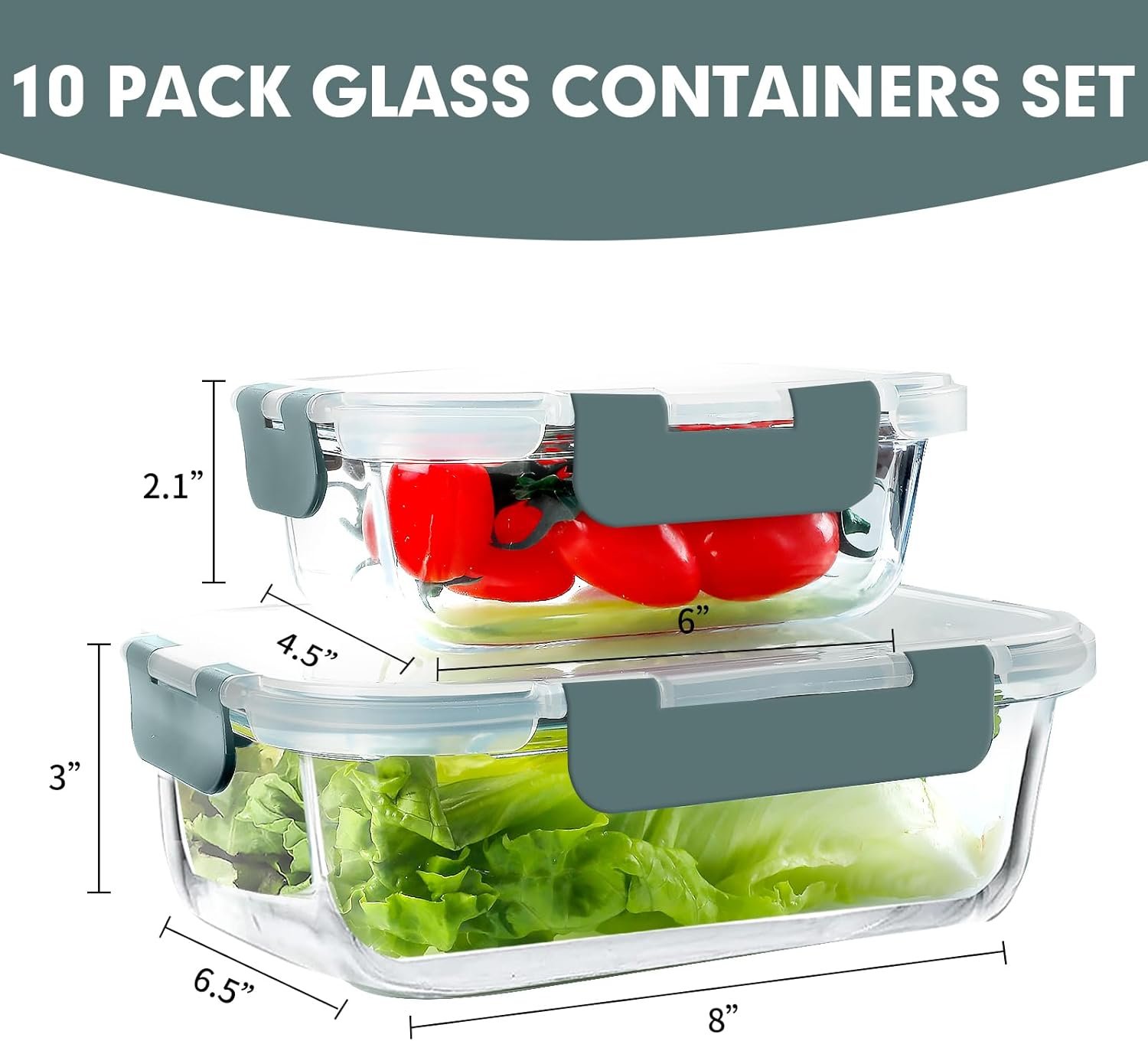 VERONES 10 Pack Glass Meal Prep Containers, Airtight Glass Lunch Containers, Stackable Glass Food Storage Containers Set with Lids,Exclusive of BPA,for Microwave, Oven, Freezer & Dishwasher,Grey